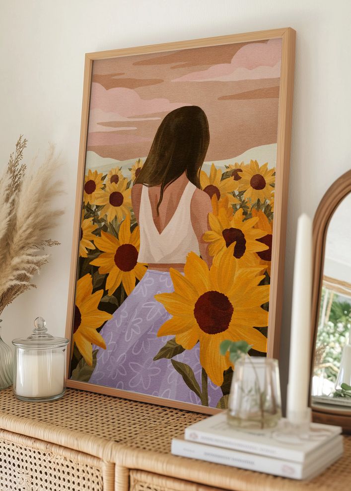 This poster captures a moody and dreamlike scene of a person standing in a field of radiant sunflowers. The sunflowers, with their golden yellow petals and dark red centres, create a warm and welcoming atmosphere. The person in the image stands with their back to the viewer, dressed in a garment with a White upper part and a Purple skirt featuring a subtle floral pattern. The soft pastel colours in the sky, with Pink and beige tones, add to the calm and harmonious mood of this unique print.
