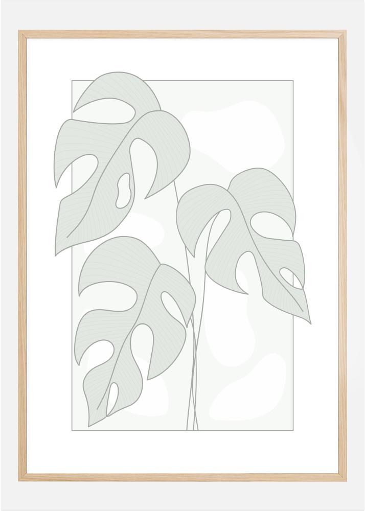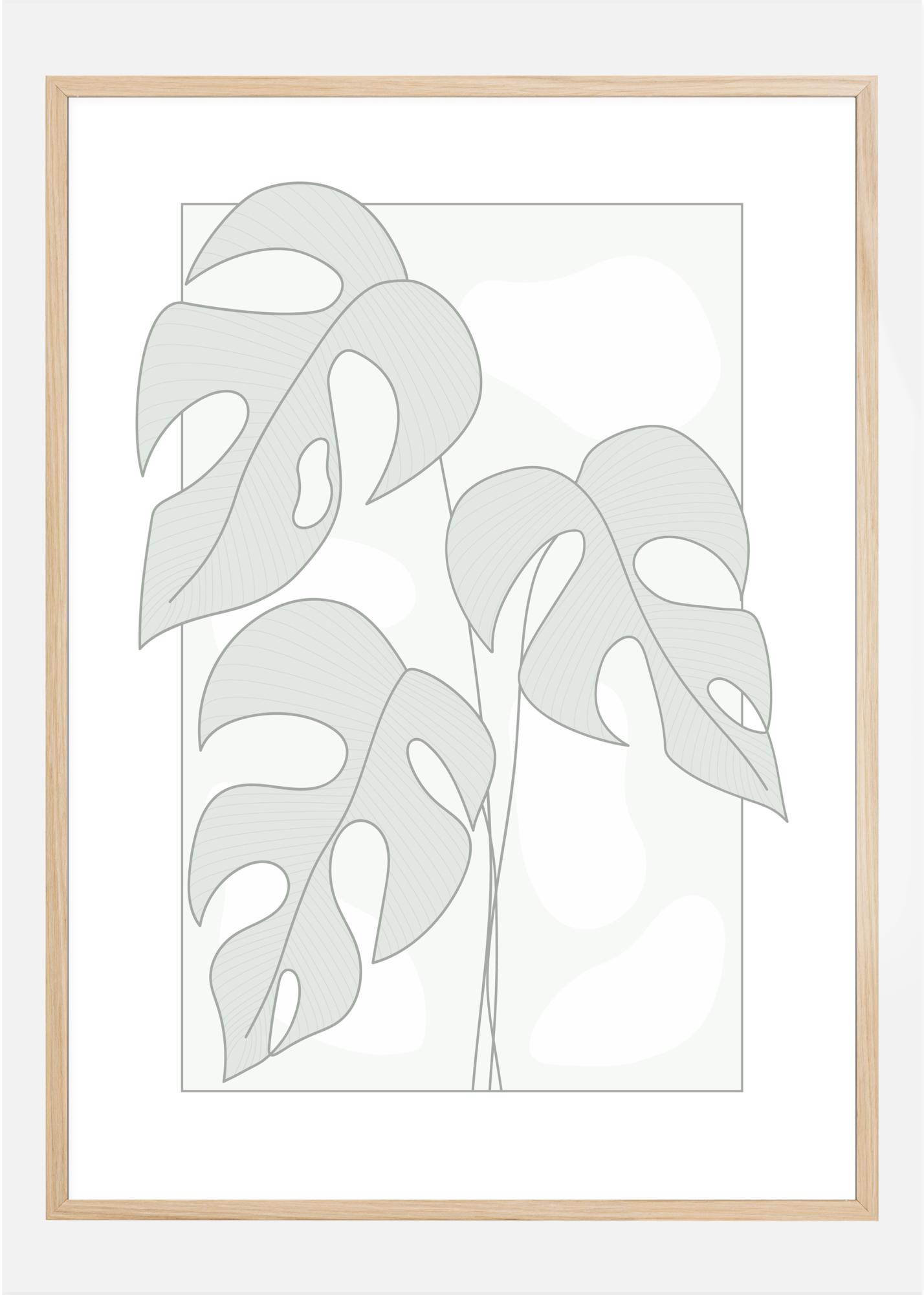 A simple poster of illustrative cheese plant leaves. Three large leaves fill the image, each one in a soft grey tone. Wafer thin lines make the stems as these elegant leaves with holes in them hang down in this image. Keep things understated by hanging on a soft green wall for a nature feel.