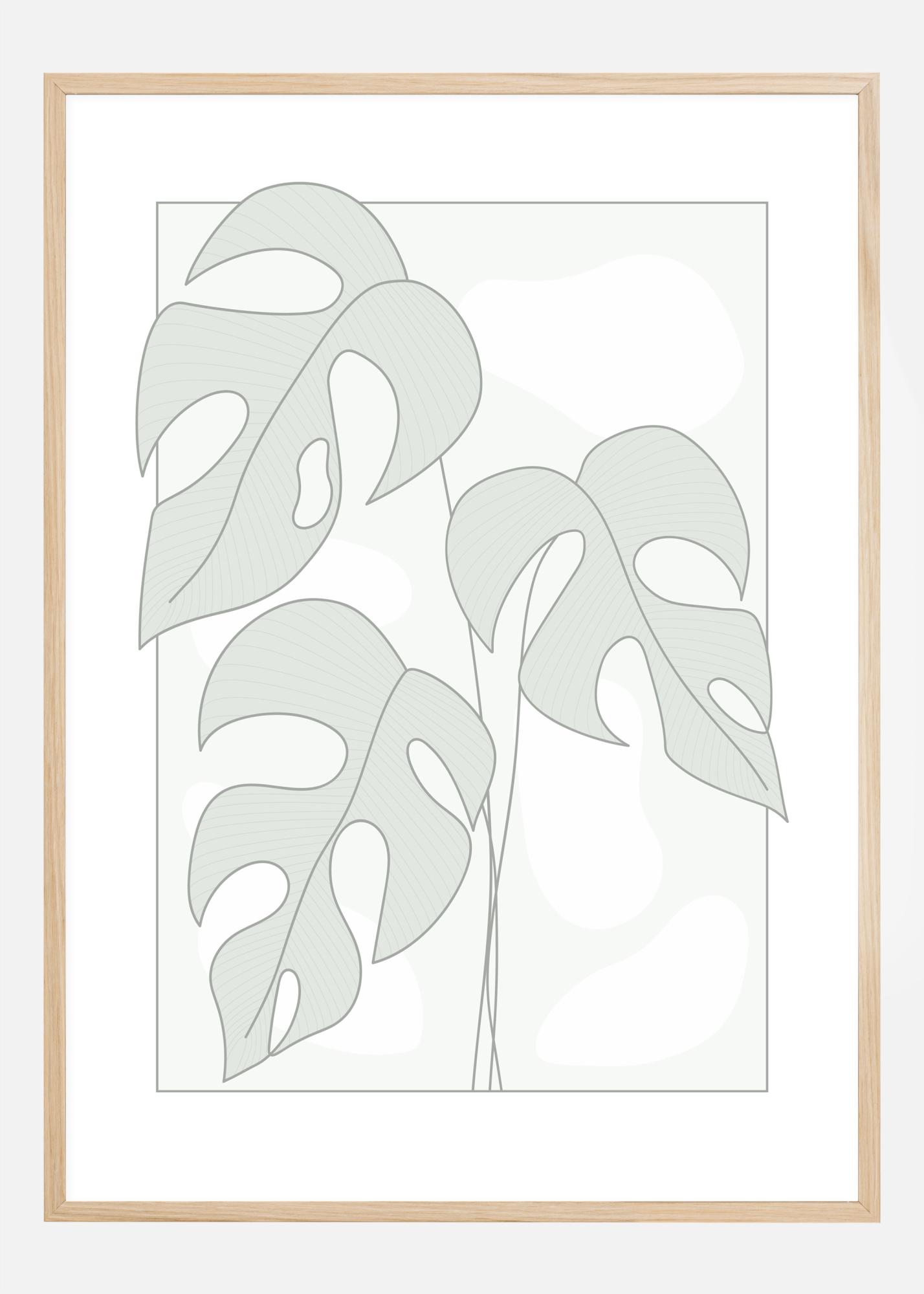 A simple poster of illustrative cheese plant leaves. Three large leaves fill the image, each one in a soft grey tone. Wafer thin lines make the stems as these elegant leaves with holes in them hang down in this image. Keep things understated by hanging on a soft green wall for a nature feel.