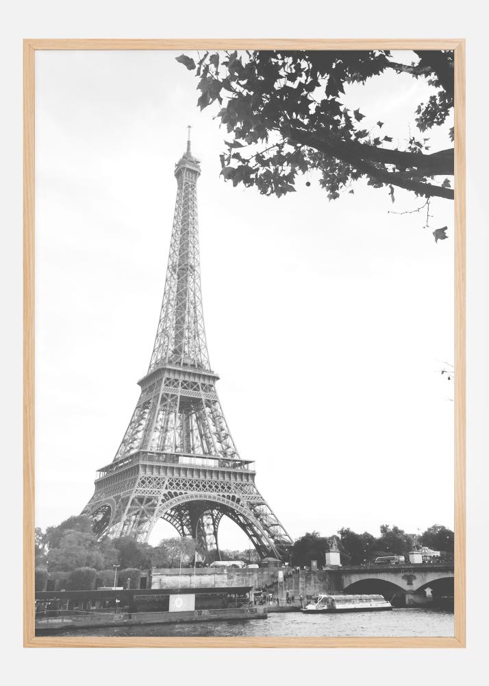 A landmark poster of the Eiffel Tower in Paris. The grey tower stands clear against a white sky. Below is the bustle of the river with a boat and a bridge. A tree branch nearly obscures the top of the tower in this simple, natural shot of this iconic monument.
