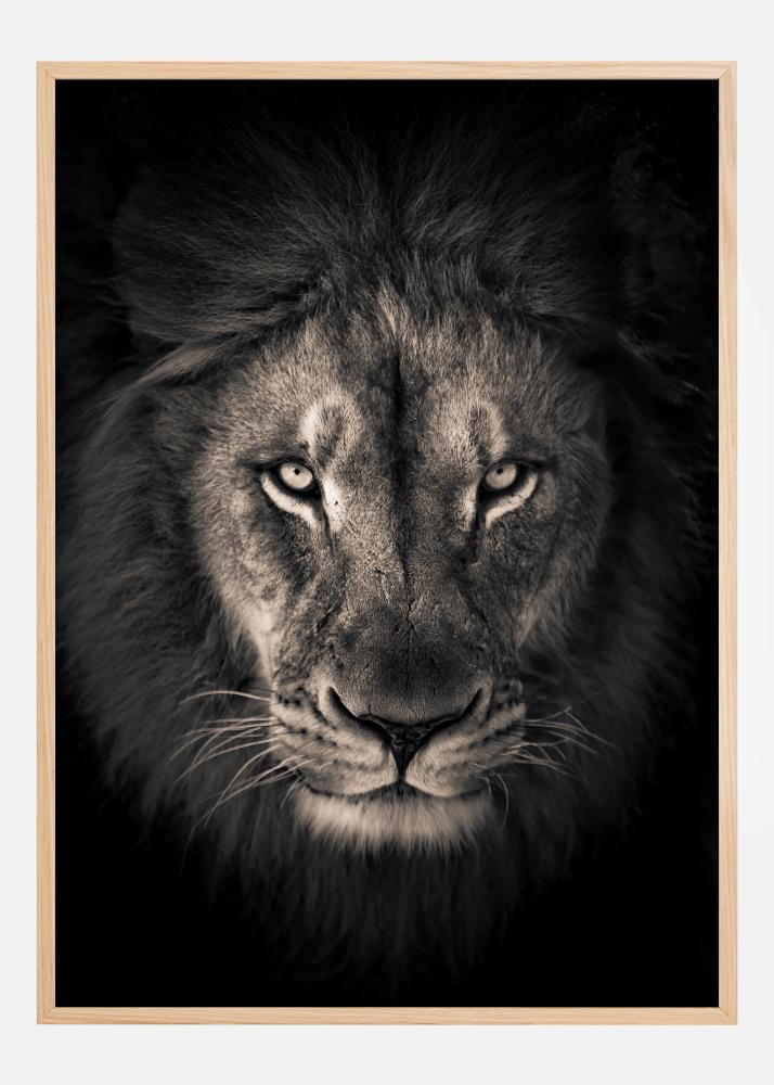 This powerful and captivating poster captures a lion's deep gaze, conveying a sense of its strength and presence. The black and white toning gives the image a timeless quality, highlighting the lion's majestic features and the intensity found in its eyes. It is a print that exudes authority and the wild, an ideal representation of the 'king of the jungle'.
