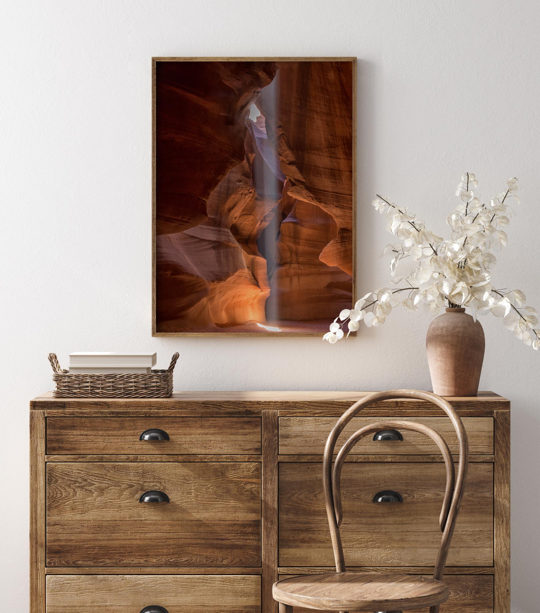 A magical poster of a beam of light travelling down through red rocks. The soft curves of the red rocks create a warm glow. The single beam of light adds a magical air to this enclosed space and further lights up the soft rocks. Bring this piece home for a dramatic addition to your home.
