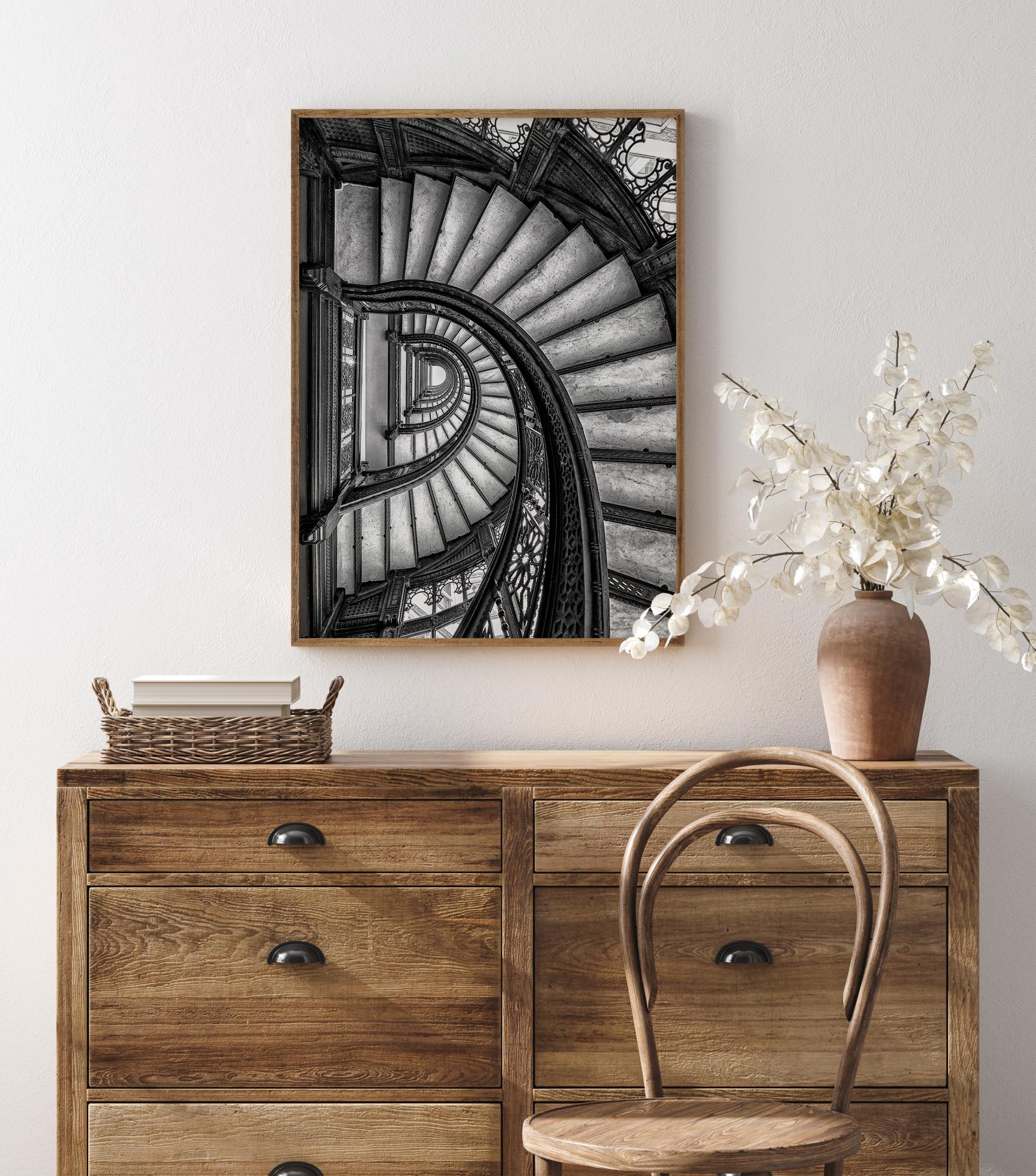 An interior poster of a set of spiral stairs winding their way down to the bottom of the building. Viewed from above, the steps spin away. The wrought-iron bannisters are intricately detailed standing out against the simple plain steps. The contrasting tones give this piece depth as your eyes get sucked right down to the bottom.