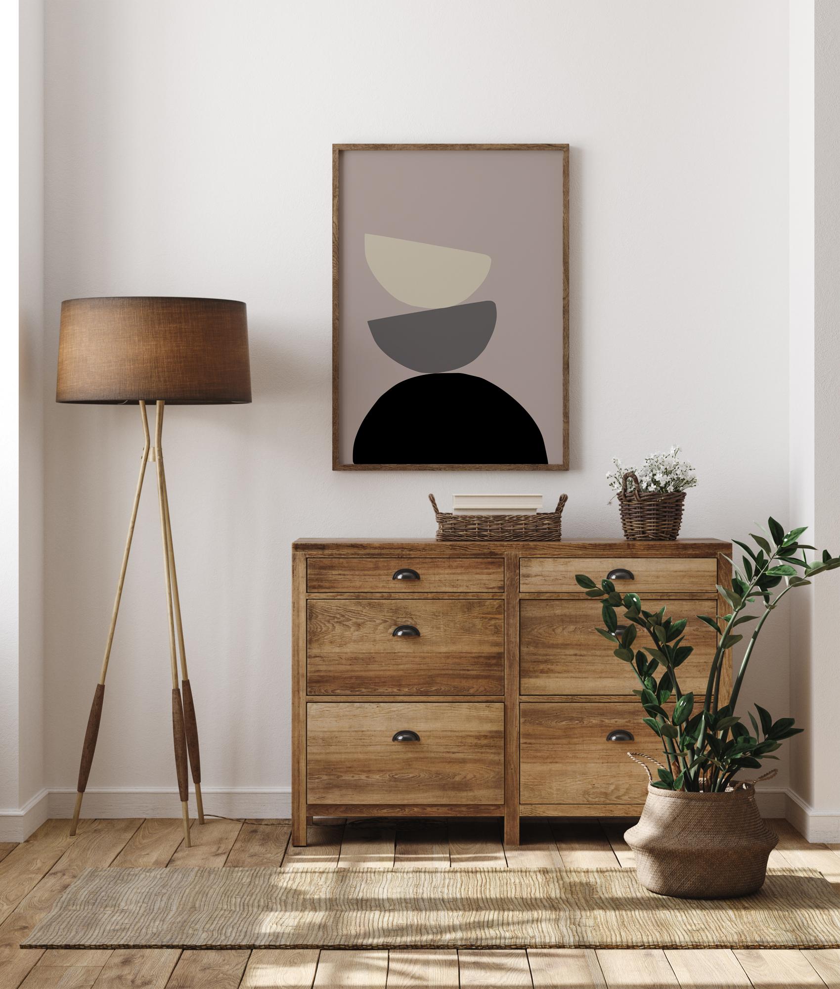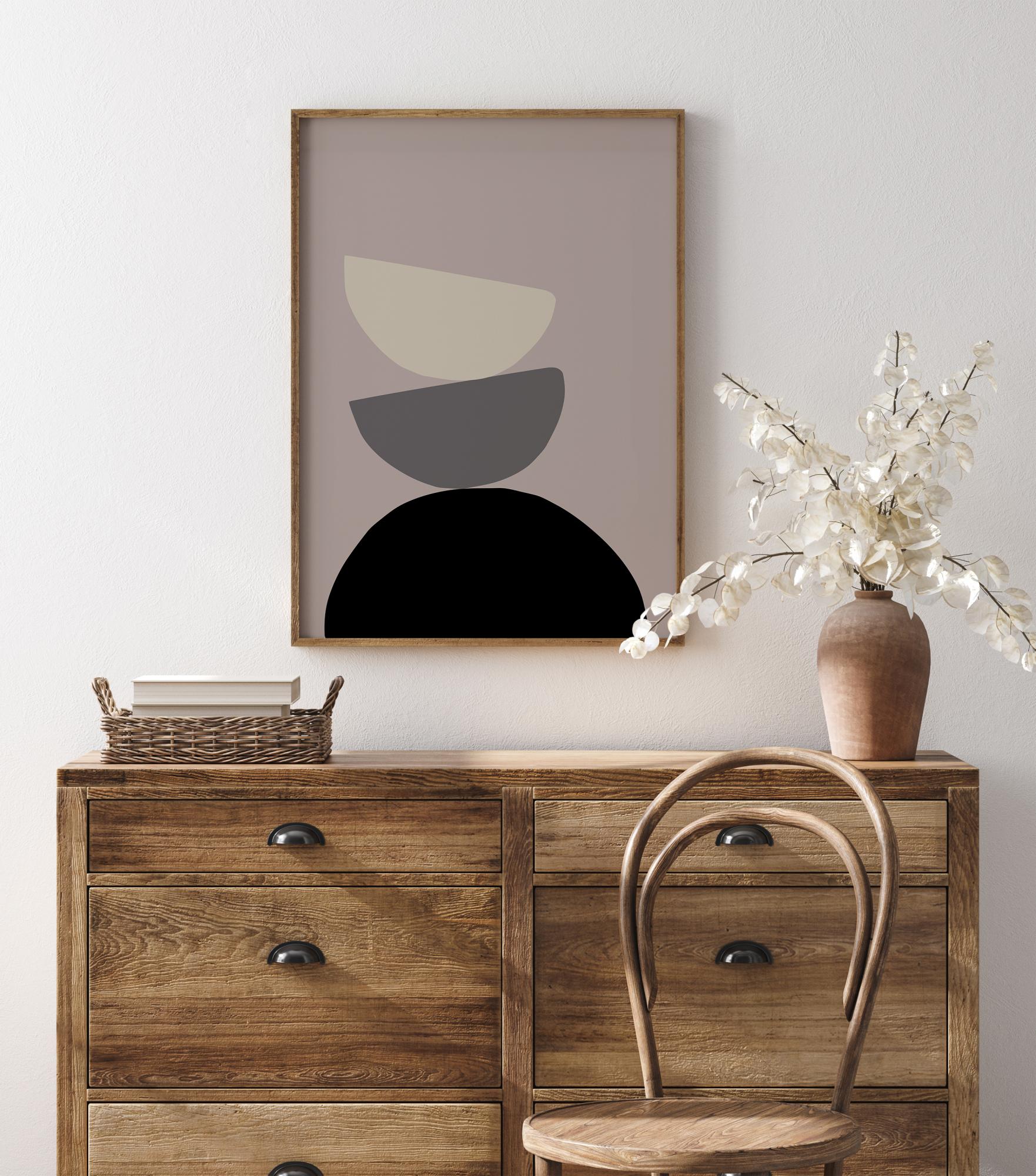 An abstract poster of three half circles stacked on top of each other against a grey background. A large black half circle sits at the bottom, a medium grey one balances on top while balancing a white semicircle higher up. Bring a cool vibe on a blue wall or a warmer vibe on beige or cream.