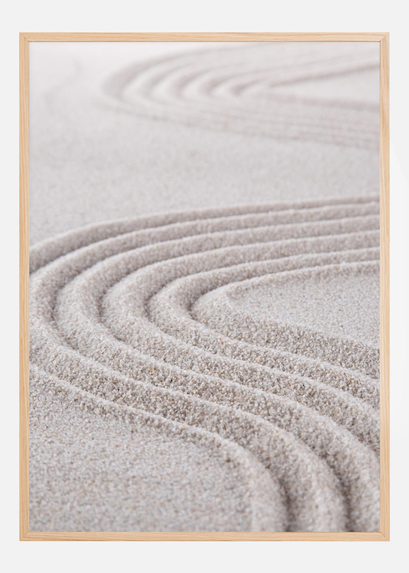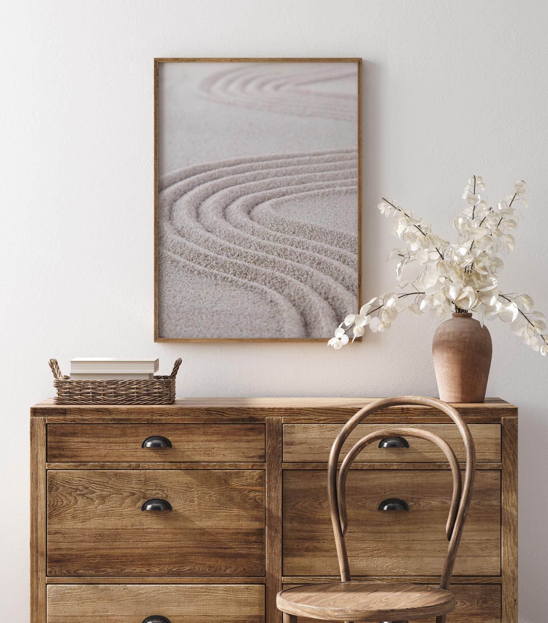 A close-up poster of lines traced in the sand. A rake has been used to create swirls in the sand, the lines equally spaced apart to create deep furrows. The close-up means you can see the grains in this fun swirling pattern. Pair with a beige wall to bring that sandy colour into the image.