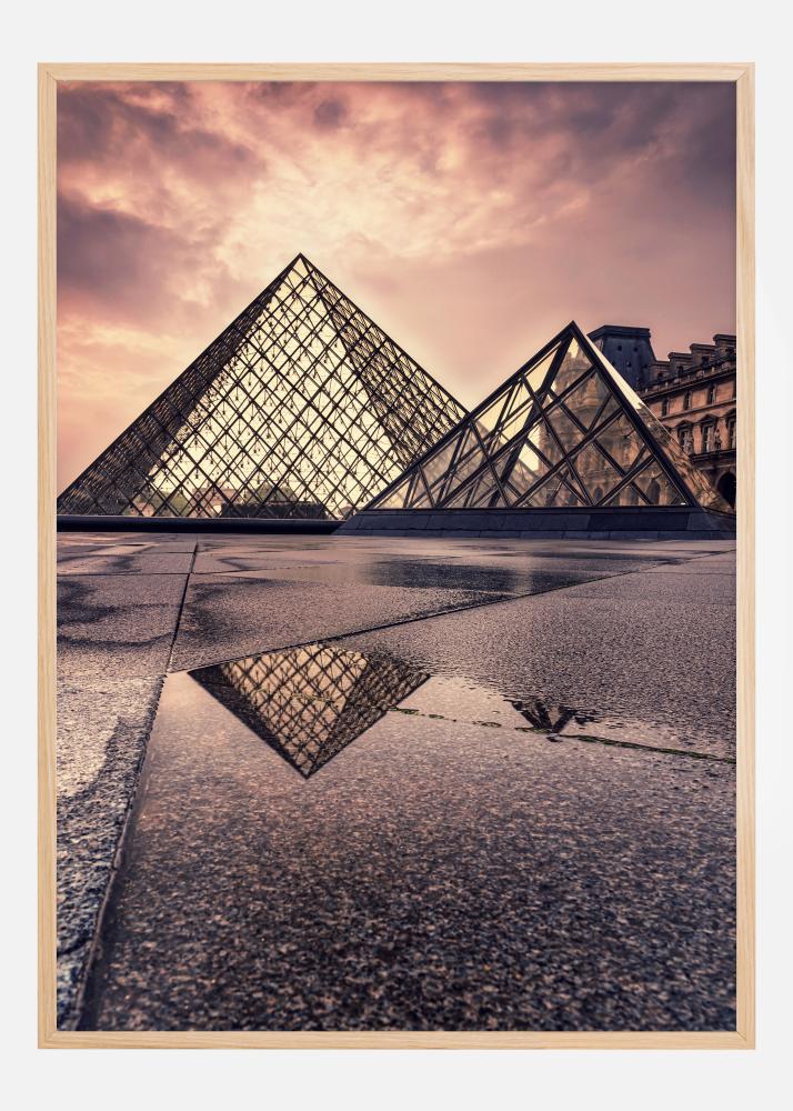 This modern poster depicts the iconic geometric shapes of a famous structure, reflected in a pool of water. The metallic shimmering triangles and glass panels are captured from a bold perspective, with a sky painted in soft shades of purple and pink as the last light of dusk. The color palette ranges from cool gray and silver tones to warm copper tones, reflecting both the construction's durability and the sky's fleeting beauty.