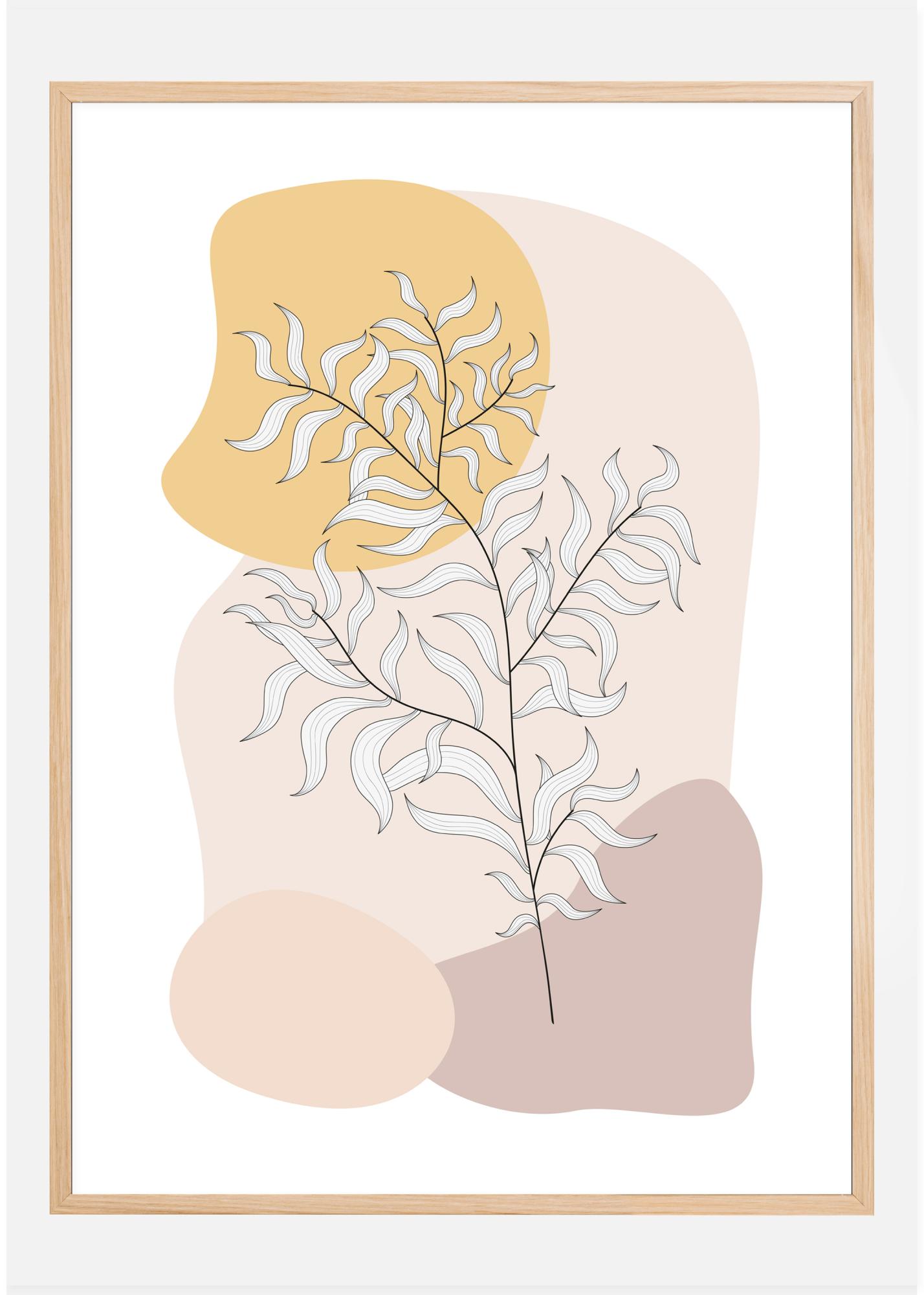 A print-style poster of a thin branch of green leaves. The stylised branch and mint green leaves sit on a series of strange shapes each one a different colour. At the bottom are grey and browns like rocks. Towards the top, a bright orange shape represents the sun shining down on this small plant.