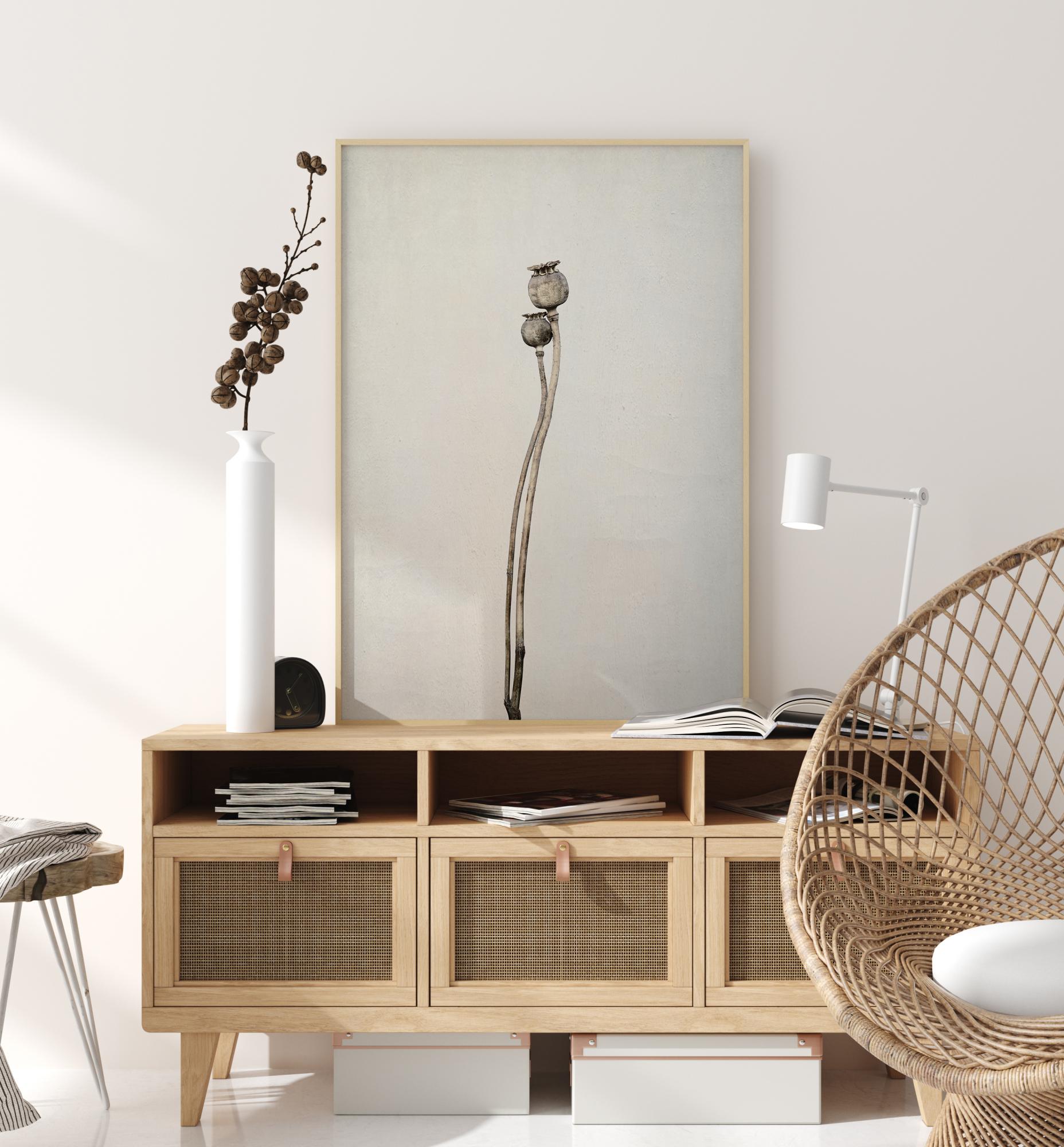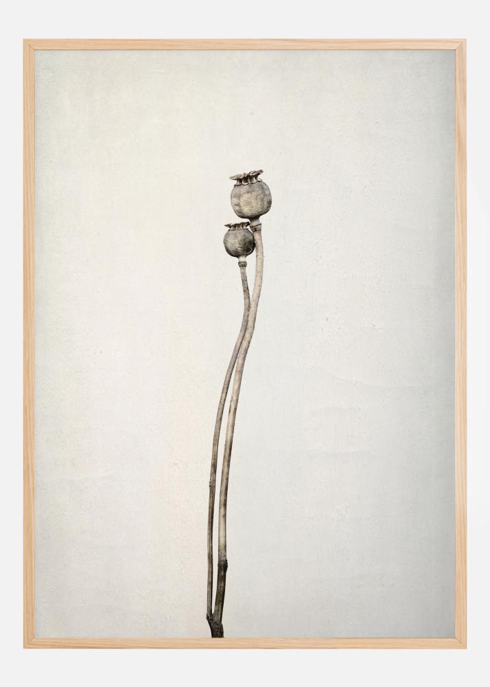 A floral poster of two poppy seed heads entwined together in a dance. The black and white image has these two long-stemmed poppies twisting against a white background. This elegant dance draws the eye as these poppy heads get ready to burst, spreading their seeds to grow new flowers.