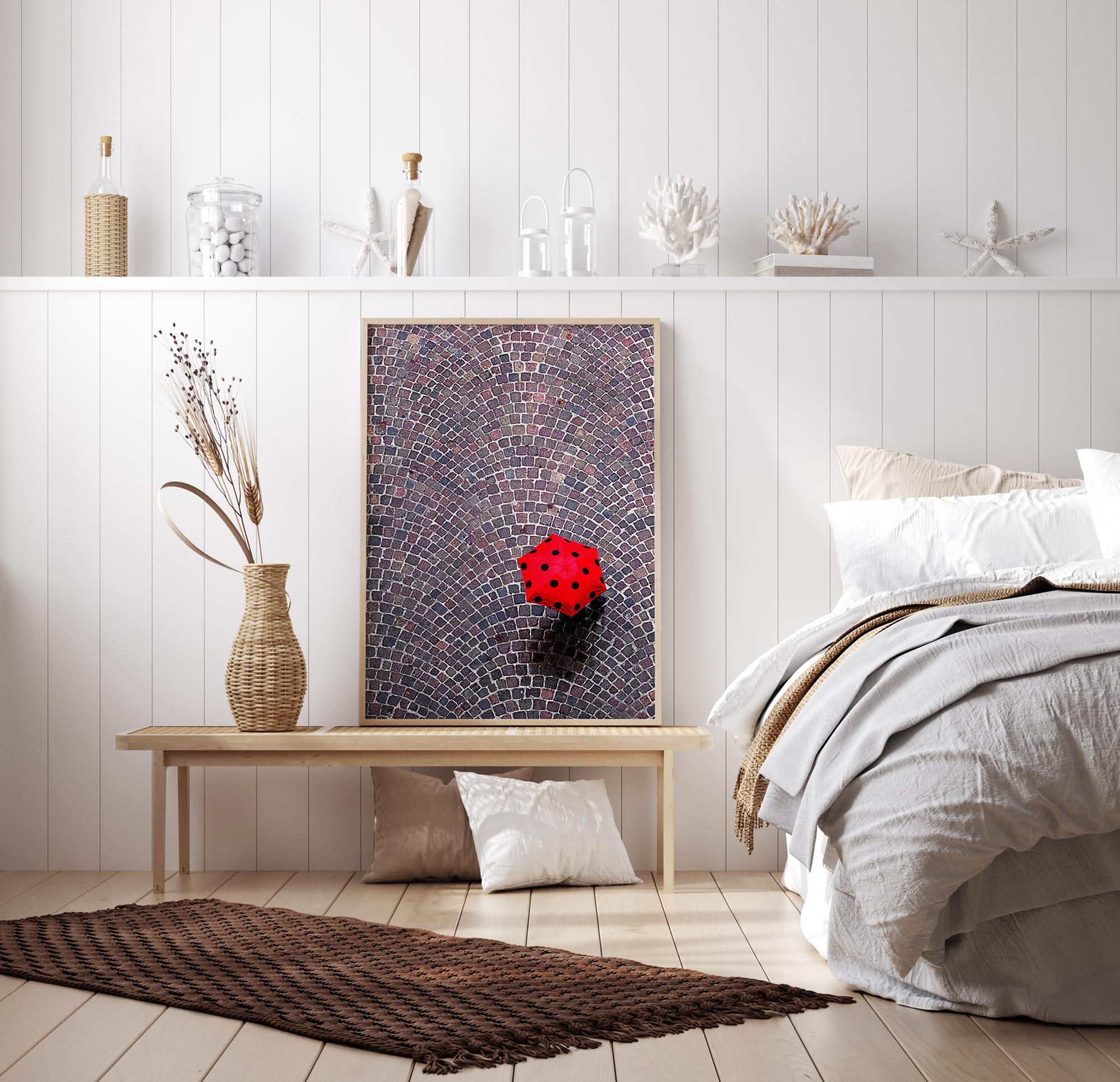 An urban poster of a pavement from above. Creating a bright spot in the blue and purple mosaic floor is a bright red umbrella with black spots. This ladybird umbrella creates a fun focal point in this patterned and tessellating shaped image.