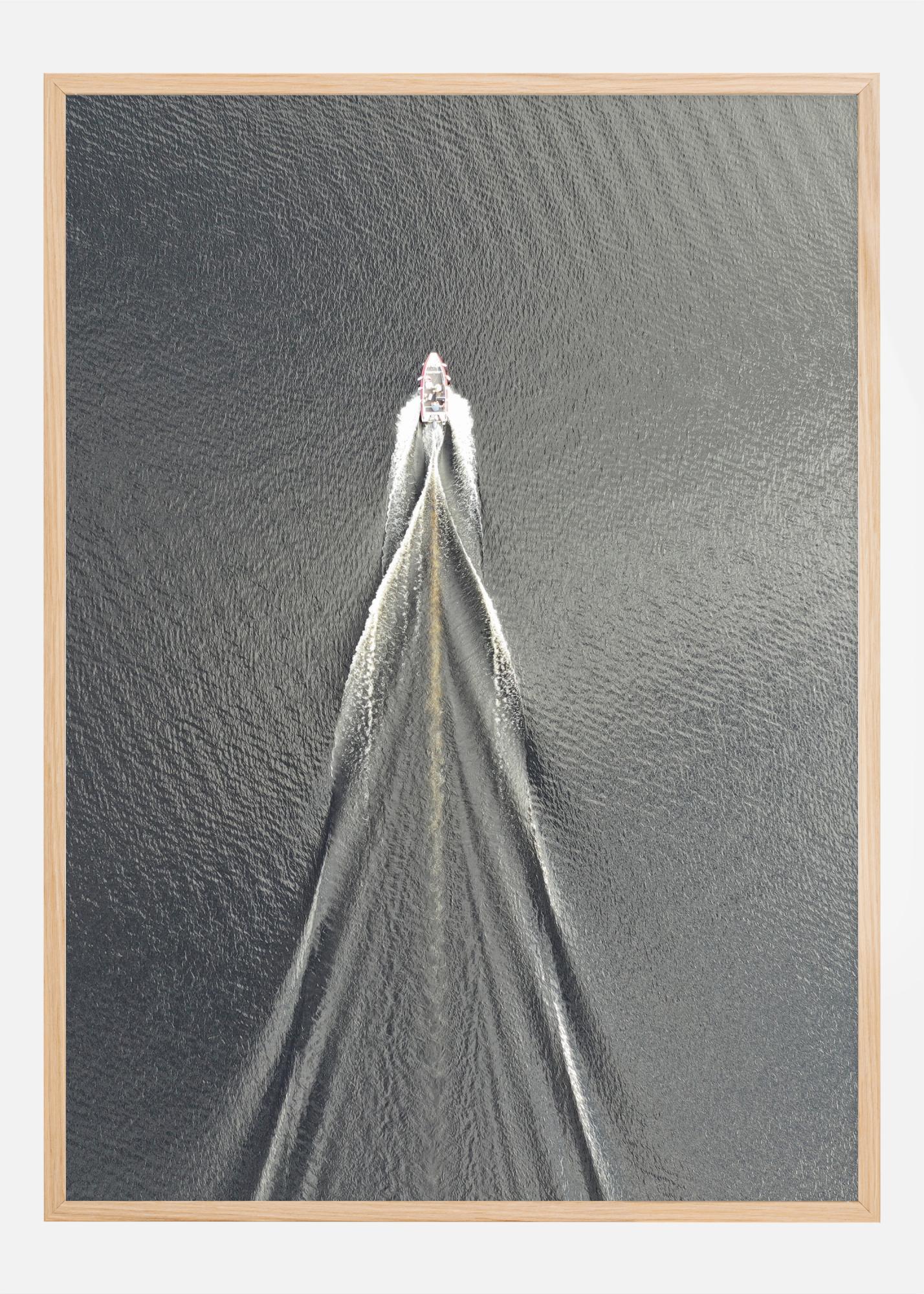 The poster "Usain Boat" captures the essence of speed and freedom. A powerful motorboat cuts through the calm water, leaving an impressive wake as a clear trace of its speed. The contrast between the dark, almost textured water and the white foam creates a visual dynamic that is both calming and uplifting.