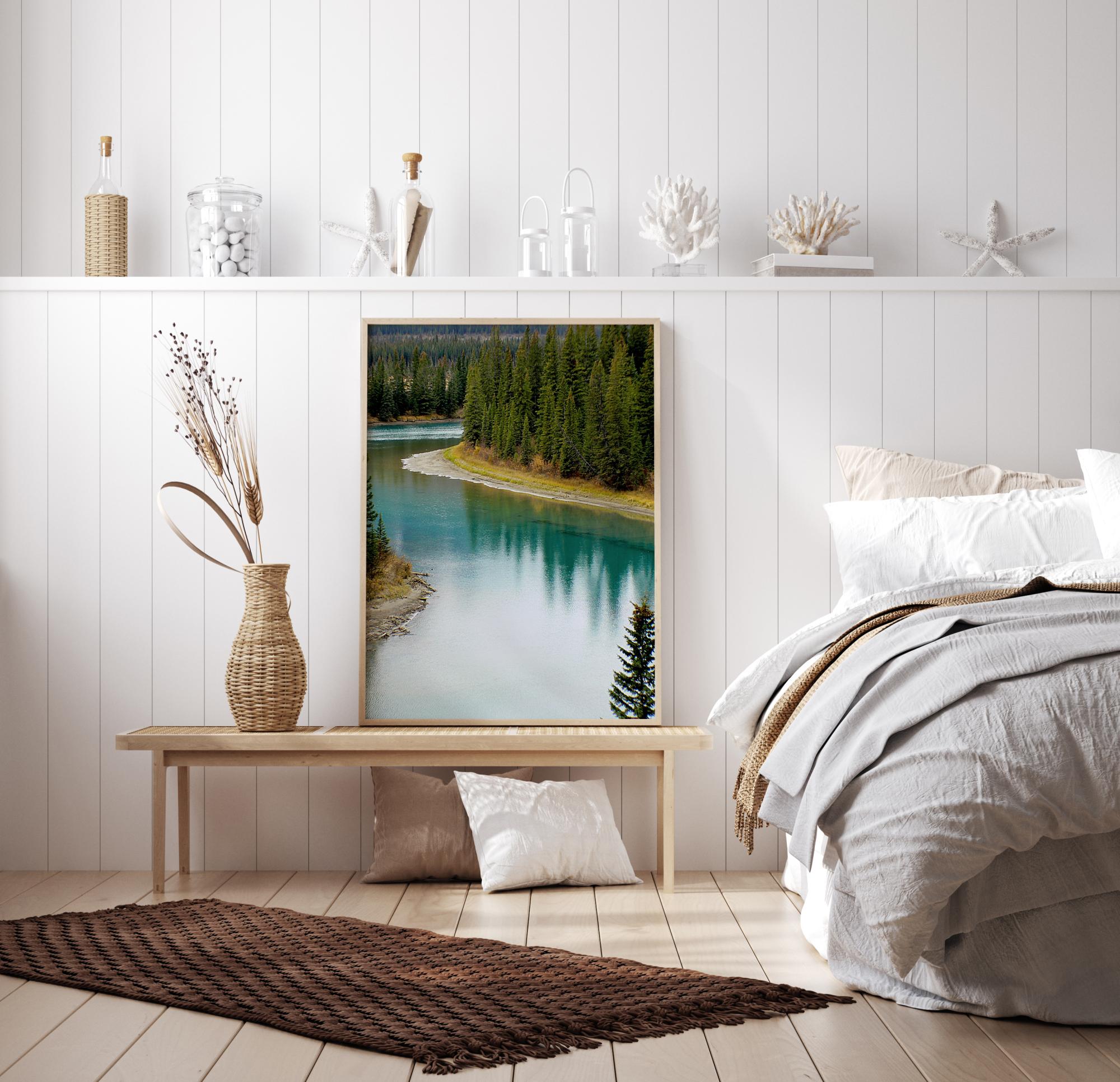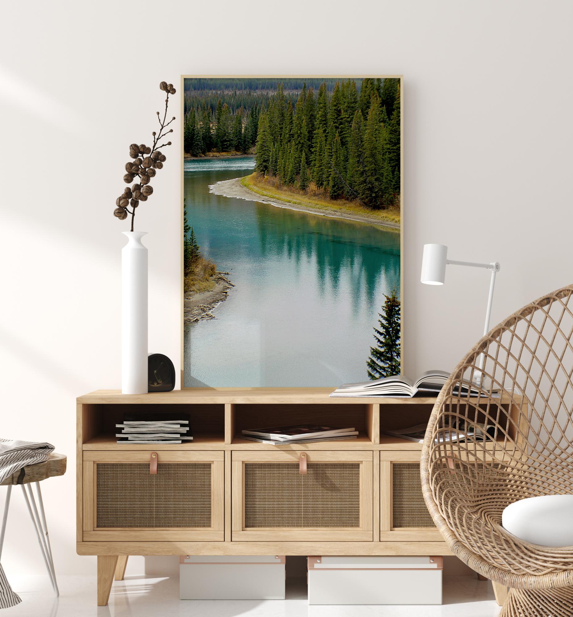 A forest poster where fir trees line the banks of a wide river as it curves its way through the countryside. The green trees stand tall as the forest heads off into the distance. The wide river has an almost rainbow tint to it and captures the tall pointed reflections of the trees on its surface.