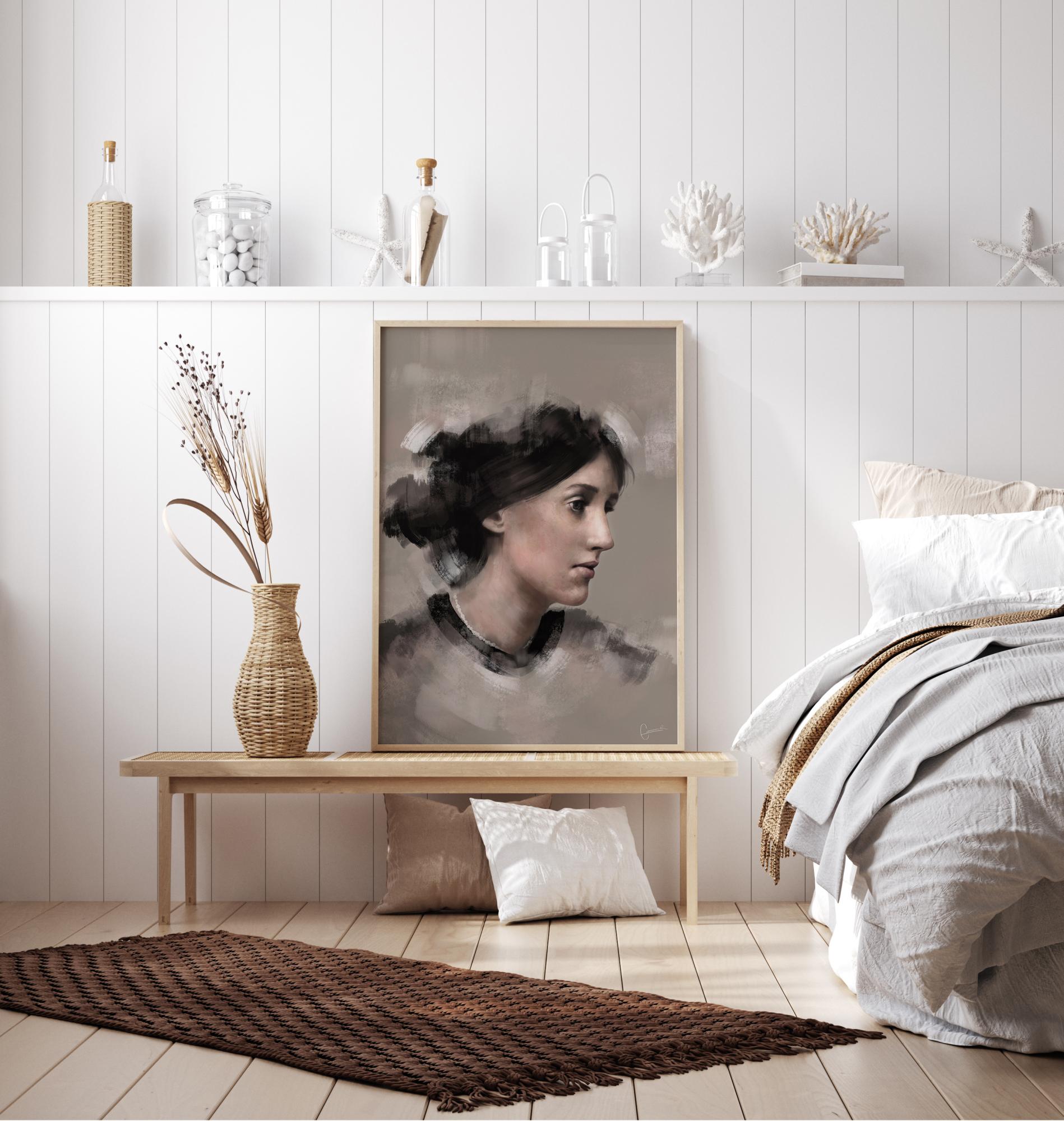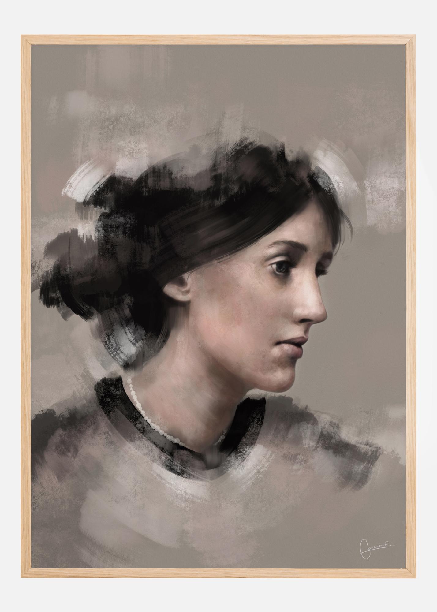 A portrait poster of Virginia Woolf in profile. Her hair is simple soft daubs of paint, but her face is rendered in careful detail. The portrait is soft and feminine and adds an almost melancholy note to her face as she looks off into the distance.