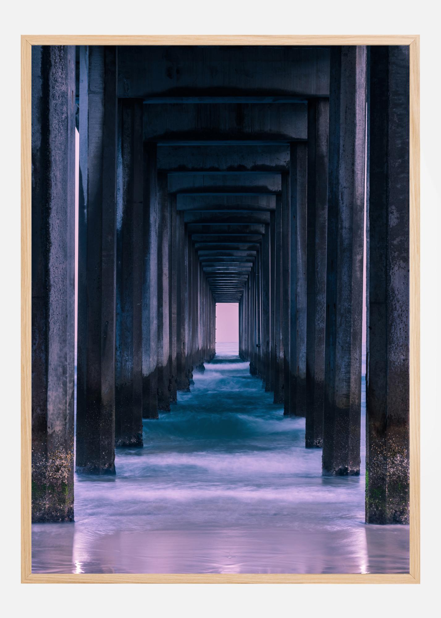 A dark poster of a corridor leading away to a light at the end of the tunnel. Thick dark blue columns line a lighter blue walkway, although the ceiling overhead is also quite dark and ominous. Follow the lighter path to reach that bright light in the distance and add depth to a room too.