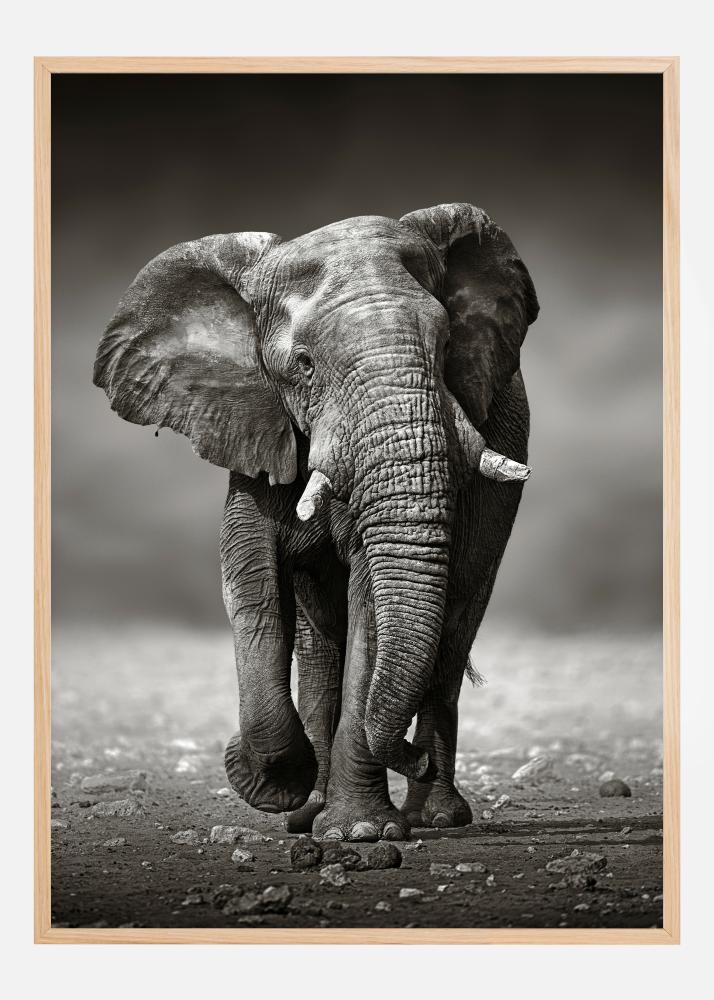 A magnificent poster of an elephant in black and white. The elephant is in mid-stride as it moves towards the camera. It looks young with short white tusks and a calm expression on its face. Visit Africa when you admire this image in your house.