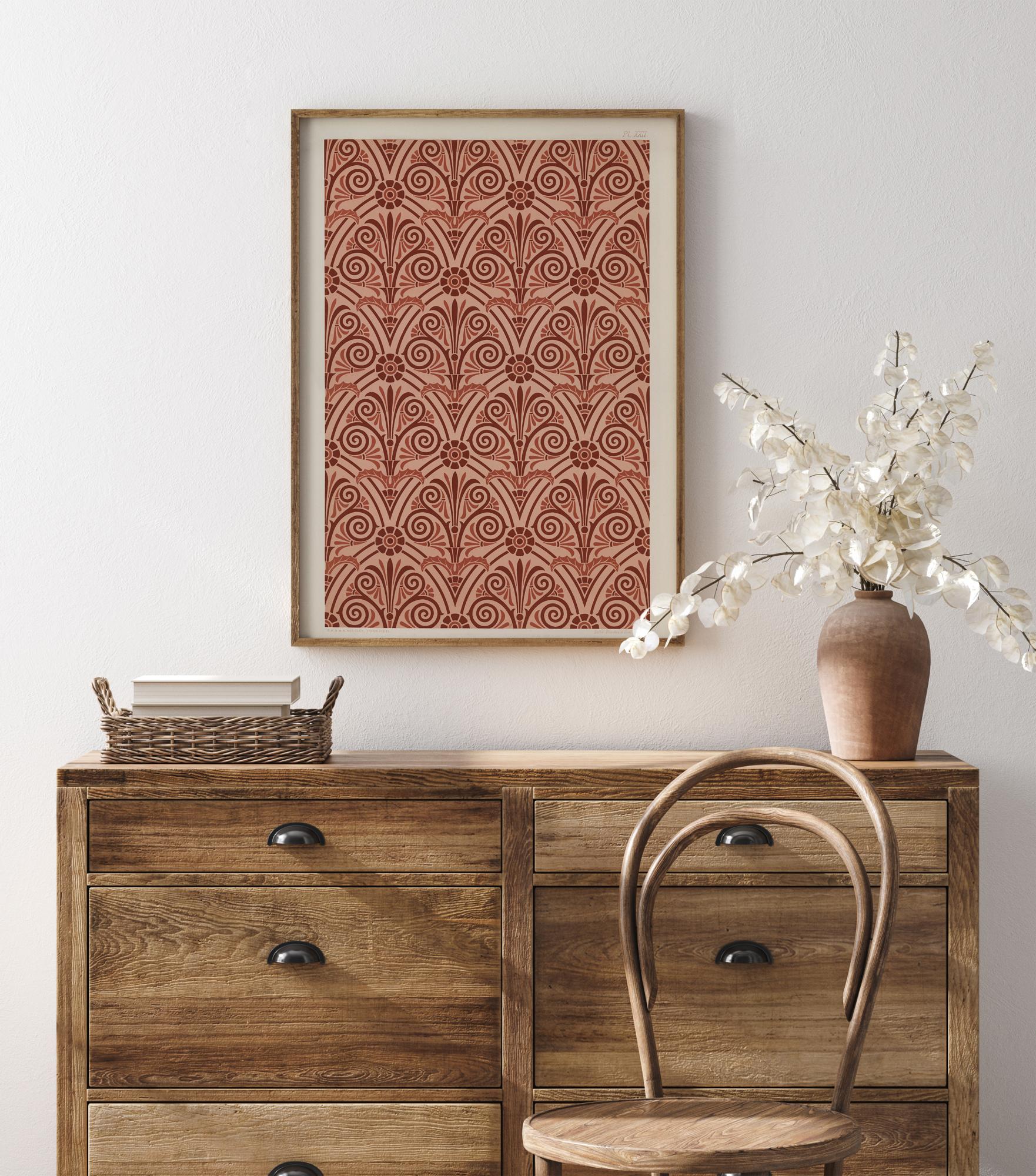 A bright patterned poster of red repeating patterns. Within the patterns are curling circles that look like leaves or fronds. There are flower shapes at intervals too, making this a botanical print pattern. Perfect for making wallpaper, see what images you see in these intricate patterns.