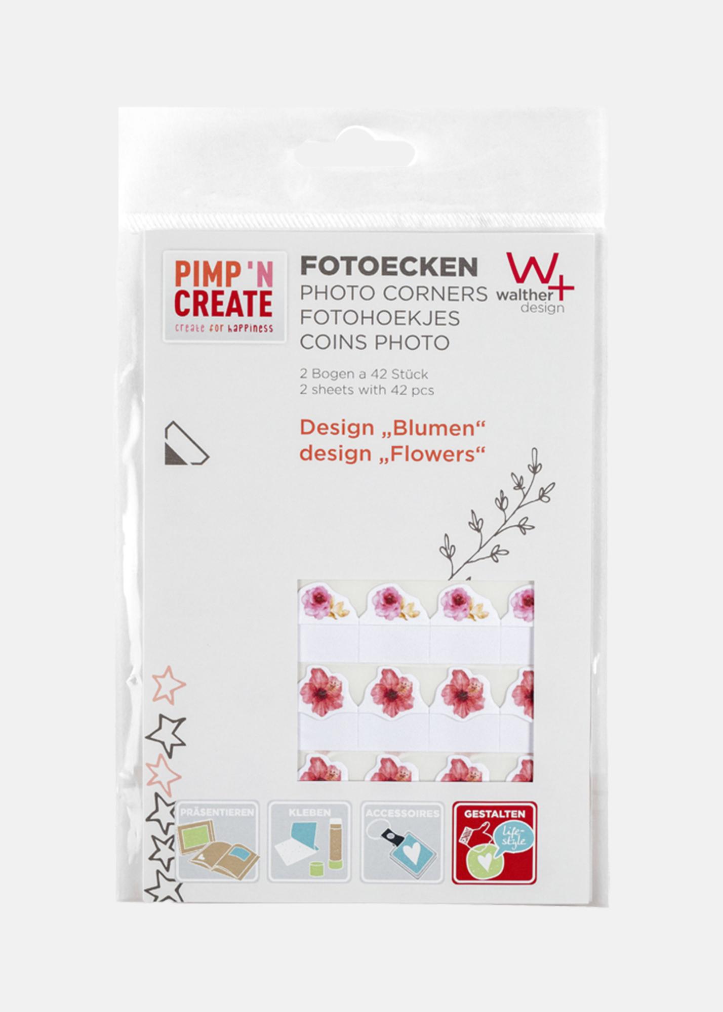 These self-adhesive photo corners in a floral design will add extra style to your photo albums. The photo corners are made of paper and are acid-free to keep your photos safe and preserve their quality over time. The package contains 2 sheets with 42 corners each.