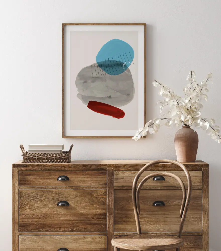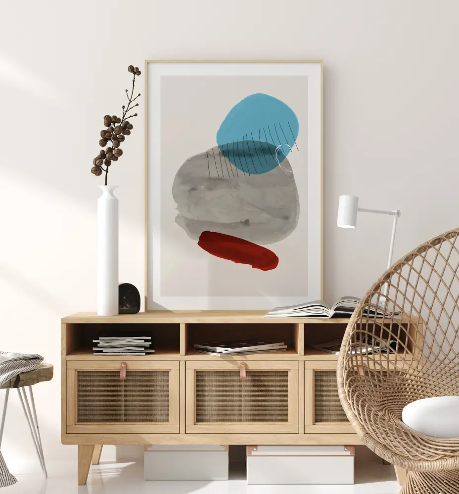 A cool minimalist poster with abstract shapes in different colours on a white background. A red slash of vibrant watercolour is at the bottom. A large blob of grey fills the centre of the image with a bright blue circle shape at the top. Lines of grey and a white circle overlay some of the shapes to create more patterns.