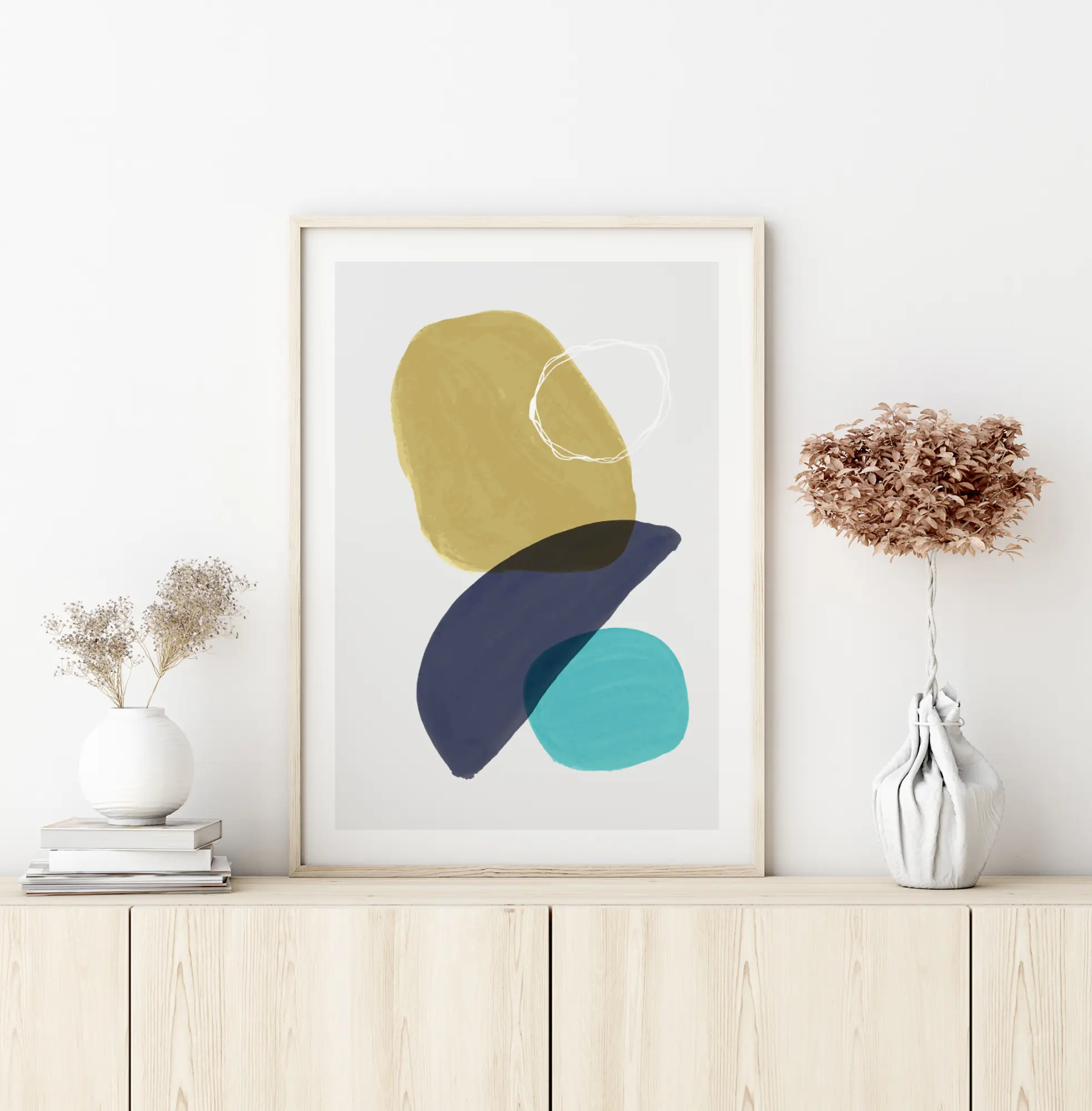 An abstract poster of different shapes in a variety of colours. A bright blue circle sits at the bottom. On top of that, is a blue half circle and above that is a beige circular shape all on a grey background. The fun vibrant shapes create this compelling image, which will brighten up any room in your home.
