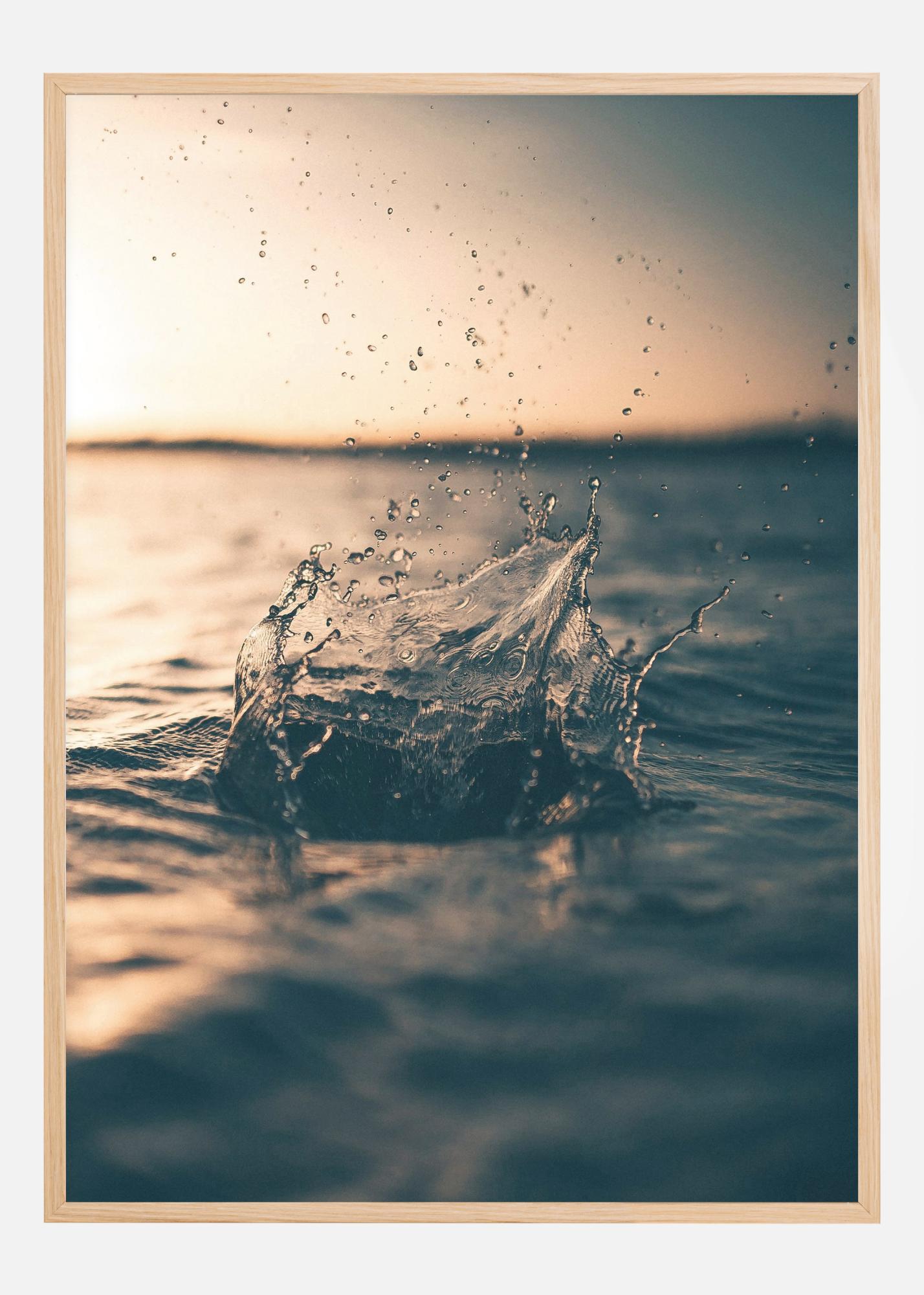 A close-up print of the aftermath of an object falling into a pool of water. The edges of the splash spring up creating tiny droplets in the air. The sun shines across from the left, lighting up this scene and capturing the spray of water as it rises. It's a mesmerising image.