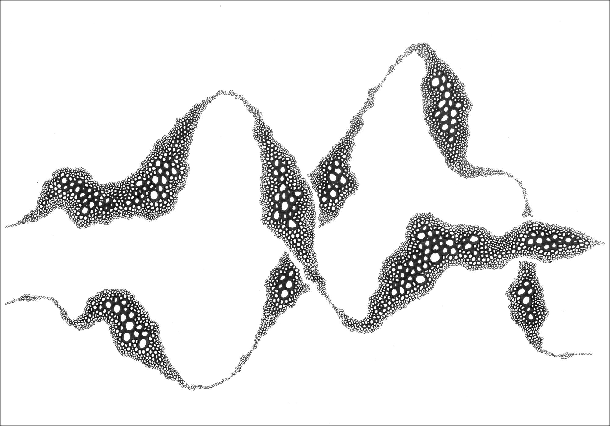 A dramatic abstract poster of different black and white circles creating strange undulating waves across a white background. There are big and small circles like bubbles attached into long waving strings that swirl and curve across the image crossing over one another in this strangely fascinating piece.