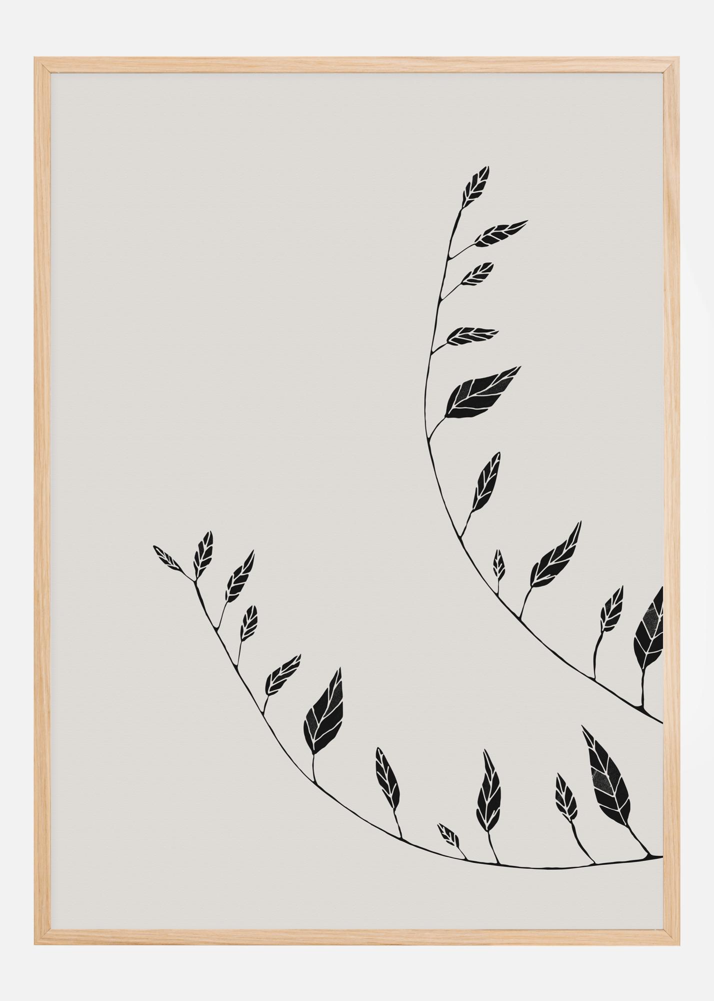 A black and white poster of simple branches and leaves across a white background. Two branches come in from the right and bend upwards to the top of the poster. The leaves all face up on one side of each branch. The curves give the feel of the plant growing as it reaches up towards an unseen sun.