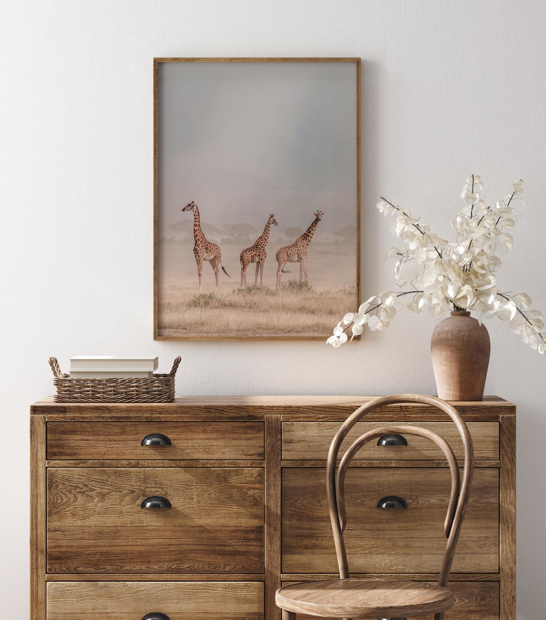 A beautiful wildlife print of three giraffes out in the African savannah. The giraffes look out in different directions as they weather the Amboseli dust devils that are spiralling up and creating a foggy effect. Visit Africa without leaving your house with this emotive poster.