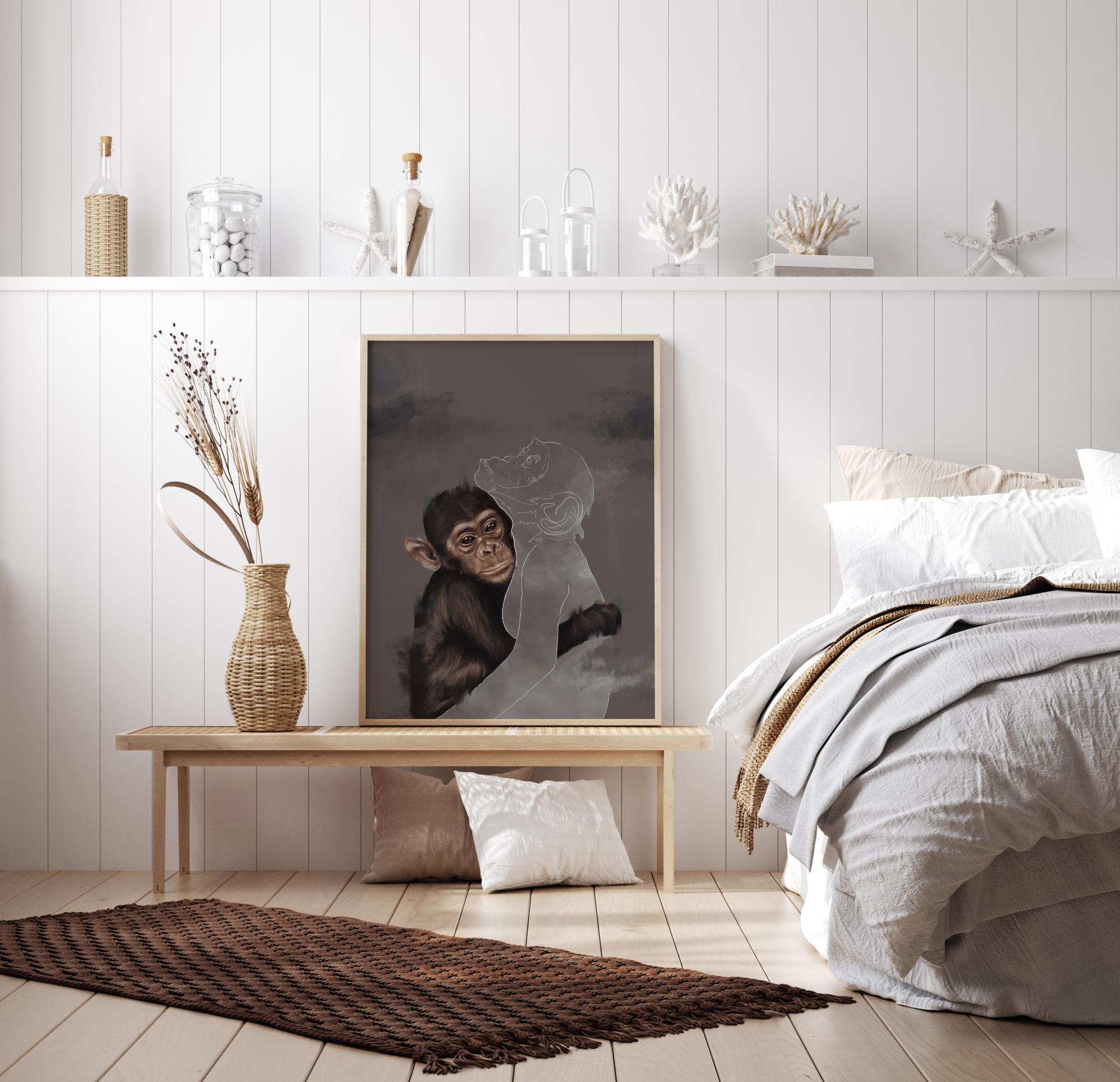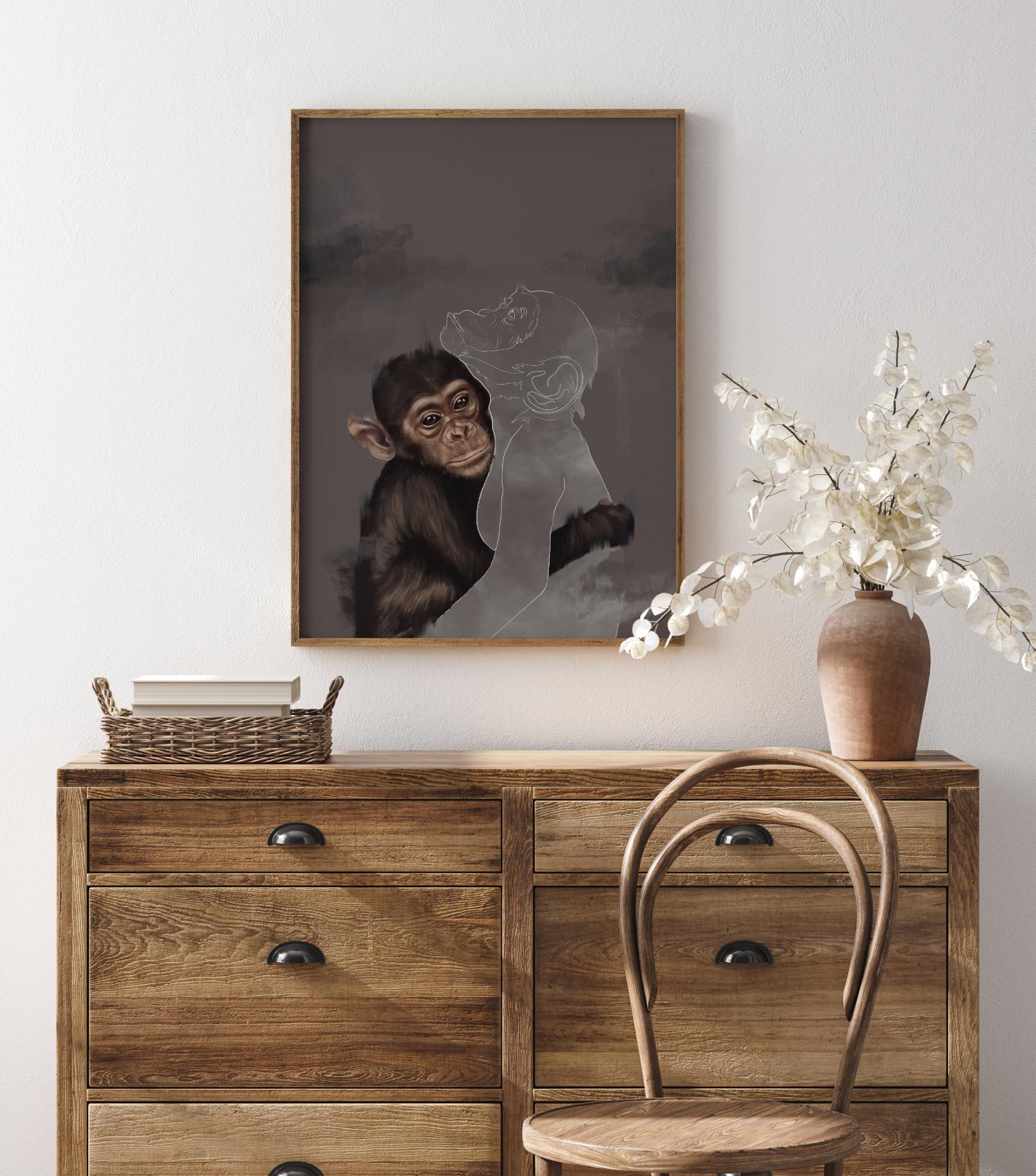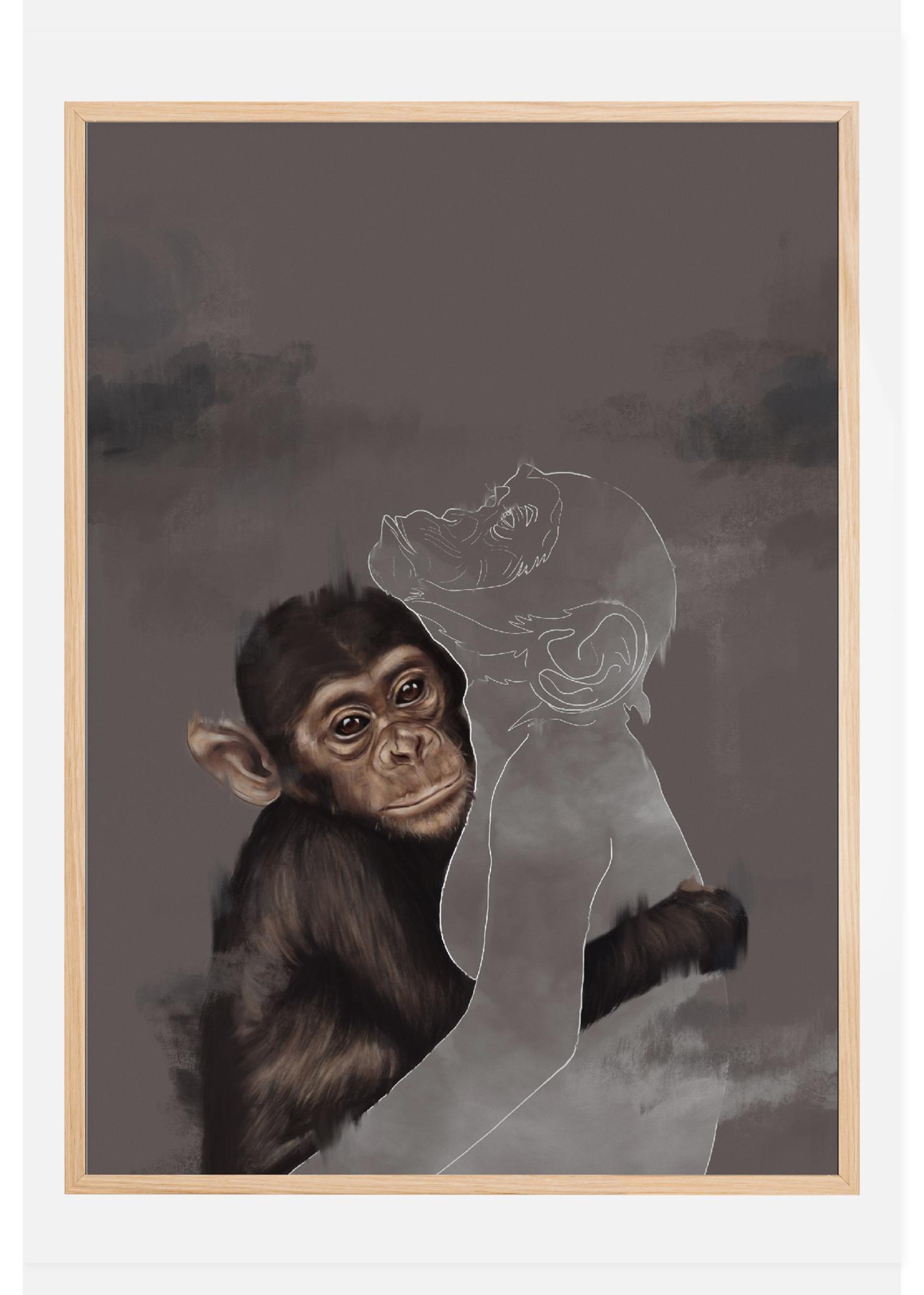 A stunning mixed medium poster featuring a young chimpanzee hugging another chimpanzee outline. This emotional poster has a detailed painting of a chimp wrapping its arm around the white outline of another. The other one is missing, so where is this other ape and why is it no longer there?
