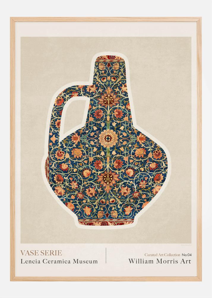 This poster, which is number 04 in the "Curated Art Collection" from Lencia Ceramica Museum, is a rich and complex tribute to William Morris and his significant contributions to pattern art. Here, a stylish vase is presented, covered with a detailed and colorful pattern that exudes the Victorian era's fascination with Oriental and medieval art, a style Morris helped popularize.