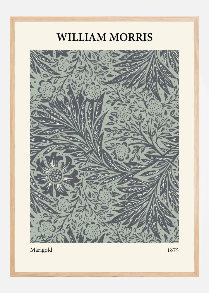 This William Morris poster, with its enchanting "Marigold" pattern from 1875, demonstrates Morris' unique ability to create detailed and harmonious botanical illustrations. The motif is full of life and movement, with its winding leaves and flowers that seem to emerge from the paper itself. The colors, in soothing tones of green and darker accent shades, create an elegant and at the same time lifelike impression.