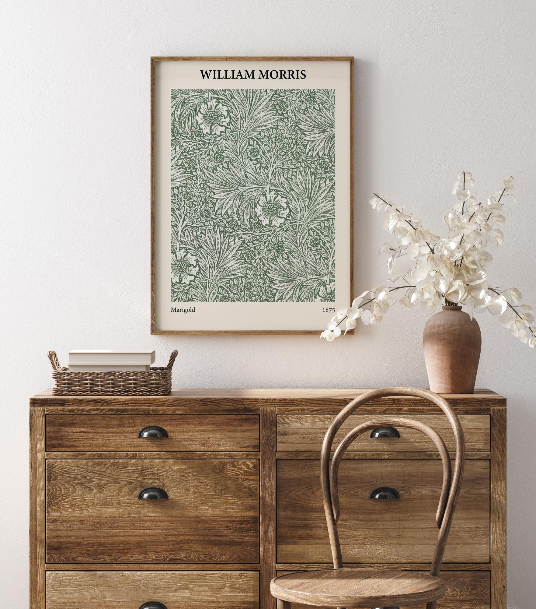 A classic poster of a William Morris marigold print. This fun pattern is all black and white lines, the leaves and flowers swirling all over the image in a semi-repeating pattern. Add this to a garden room to get that full botanist feeling.