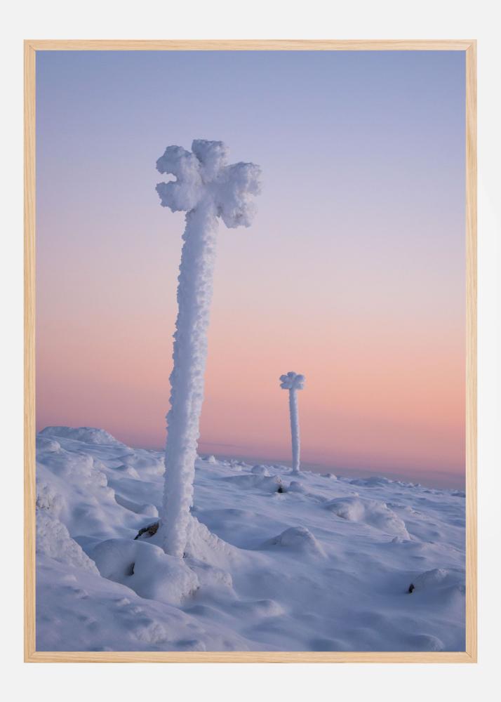 This poster depicts a dreamlike winter landscape, where snow-covered formations rise from a soft, undulating field of snow. The motif is characterised by stillness and minimalism, with frost-clad pillars that almost resemble sculptures in nature. The sky features a beautiful gradient, giving the image a calm and poetic feel—perfect as a print or poster if you want to create a harmonious and modern atmosphere at home.