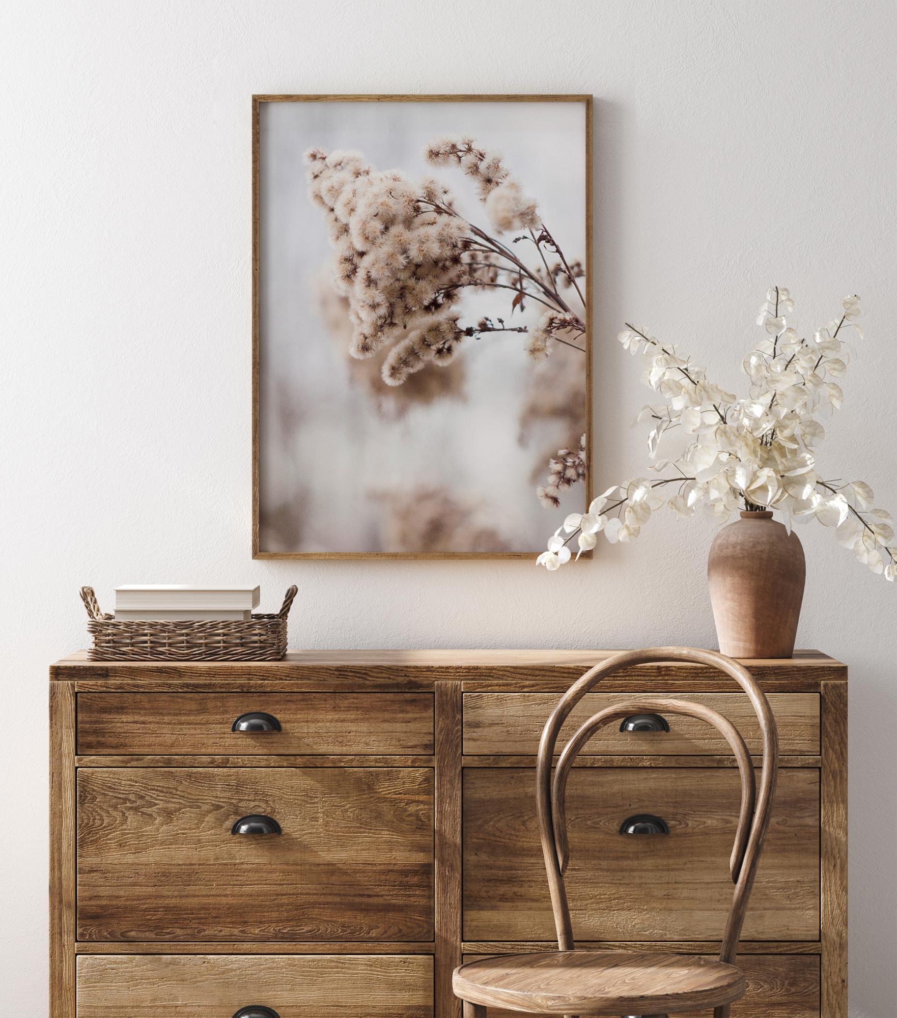 A floral poster with some soft round flower buds on a branch. The pink of these blooms stands out against the soft blue and grey of the background. Marvel at the detail in each of these buds as they hang into the picture in this wintery seasonal image.
