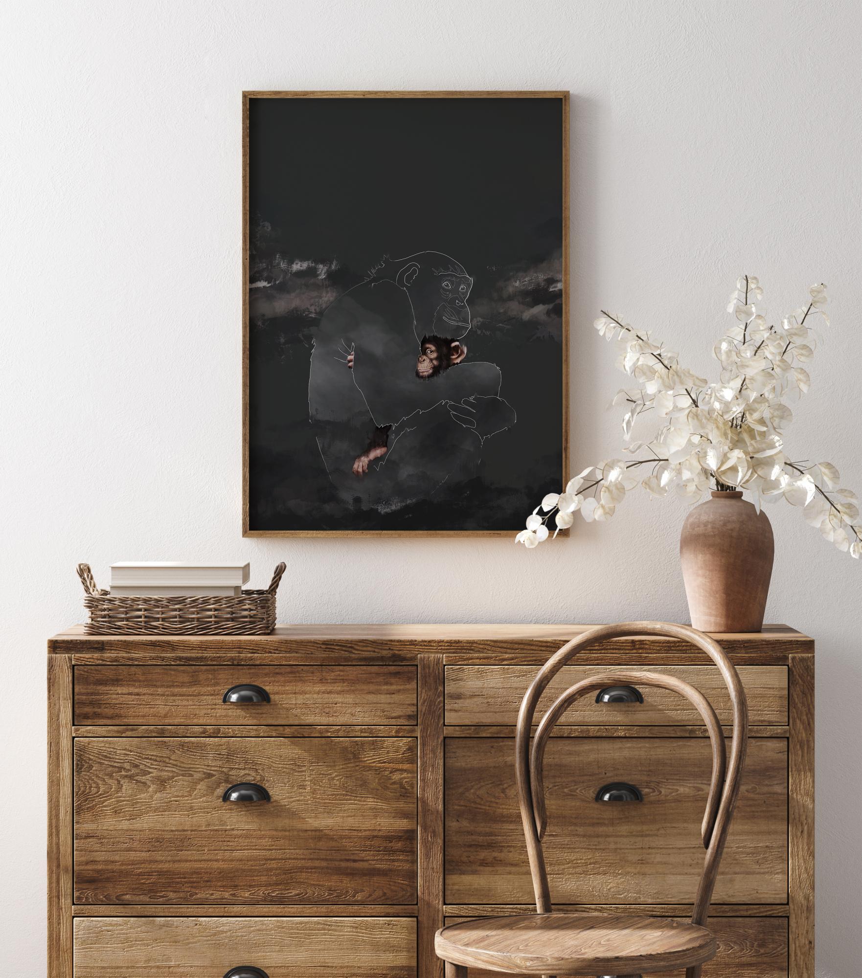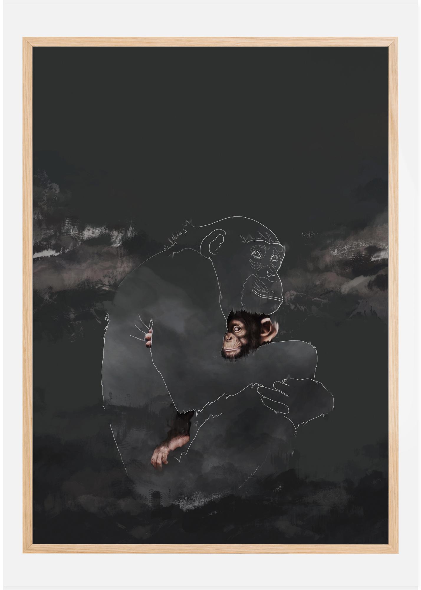 An emotional poster of a chimpanzee baby hugging the missing image of its mother. Wish You Were Here is a moving image as the baby chimp hugs nothing but the outline of its mother sitting in the black sky on soft clouds.