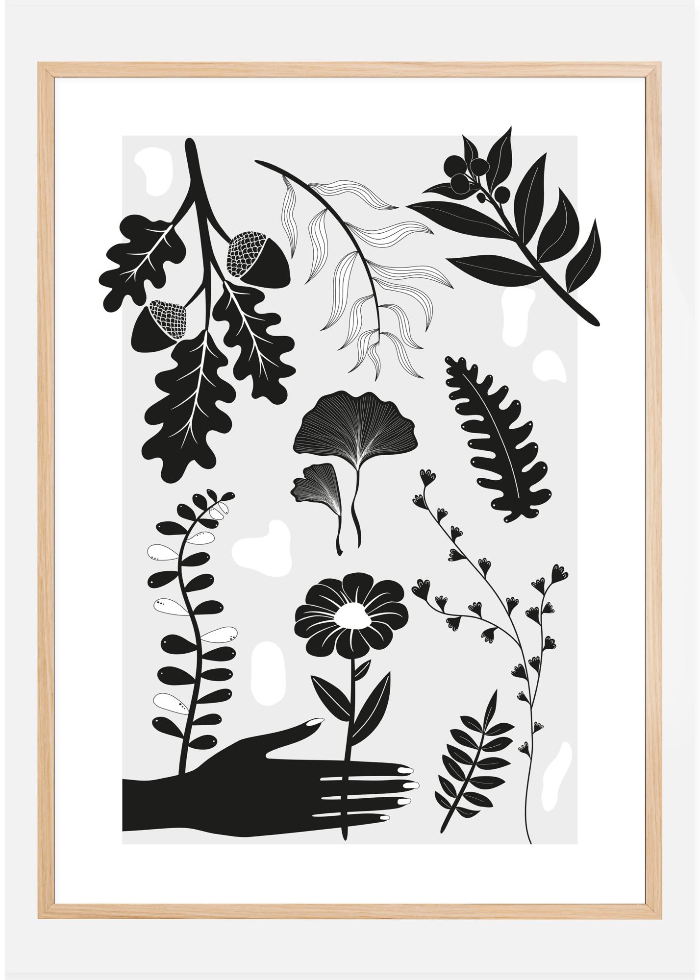 A bold poster with black and white print designs of different leaves, plants and flowers. A black hand reaches out to grab one of the stylised flowers. Acorns, flowers, ferns and more fill this simple yet interesting print. Get yourself into a botany mood when you add this plant poster to your home.