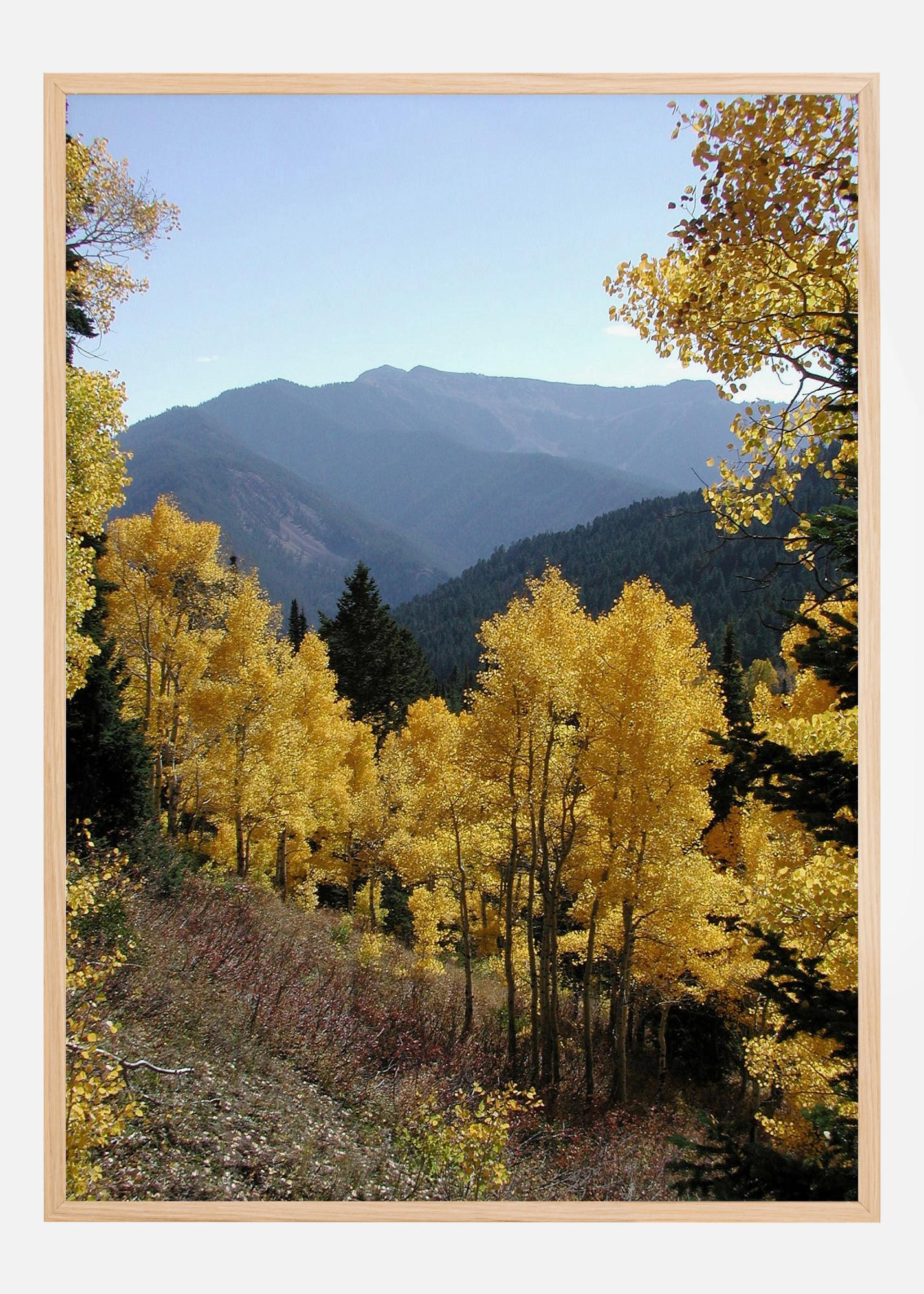 A bright landscape print of yellow trees with a blue mountain range behind. The yellow trees create a truly Indian summer feel as they light up this forest scene. Feel the warm breeze over the mountain in this early autumn image.