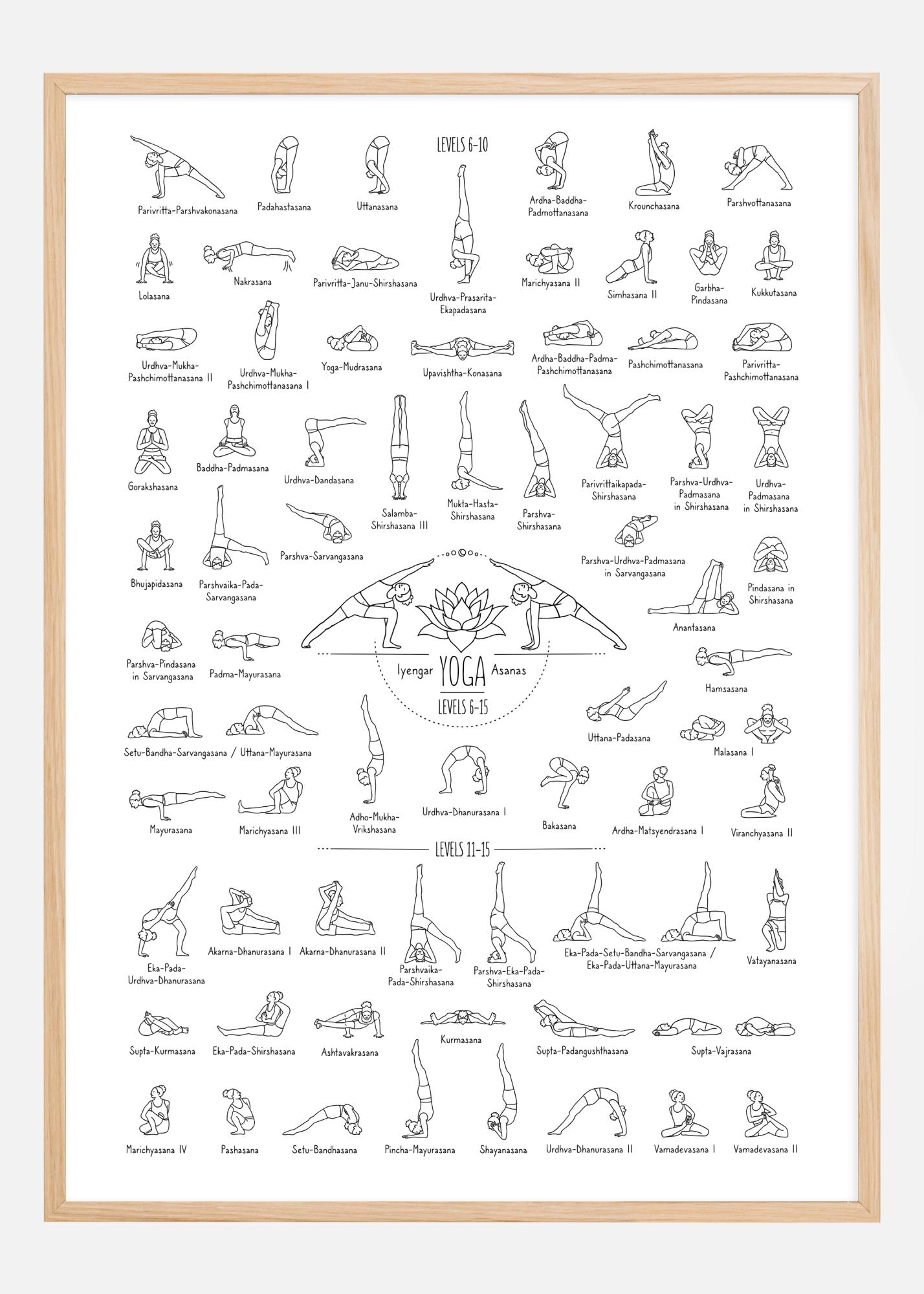 This comprehensive and instructive poster provides a visual guide to Iyengar Yoga Asanas for levels 6 to 15, presented in a clear and methodical layout. The detailed illustrations are rendered with precise lines that highlight the unique shapes and positions of each yoga pose. Above each image is the name of the asana in Sanskrit, making it easy for practitioners of all levels to identify and practice each position.