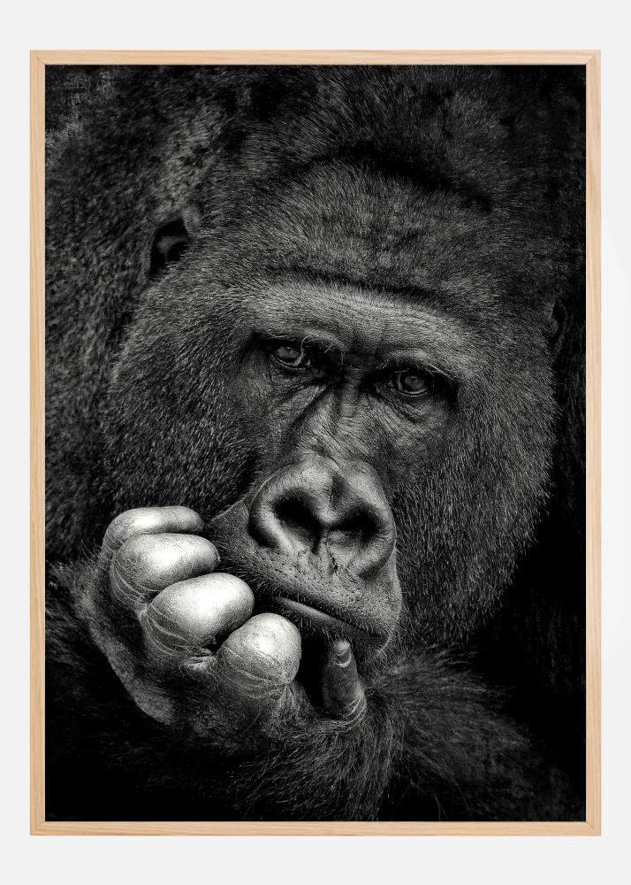 A stunning portrait poster of a gorilla in a contemplative pose. The gorilla stares with an unfocused gaze towards the camera. One hand curled under the chin as if pondering important questions. The black and white print picks out all the details in the face of this utterly incredible great ape.
