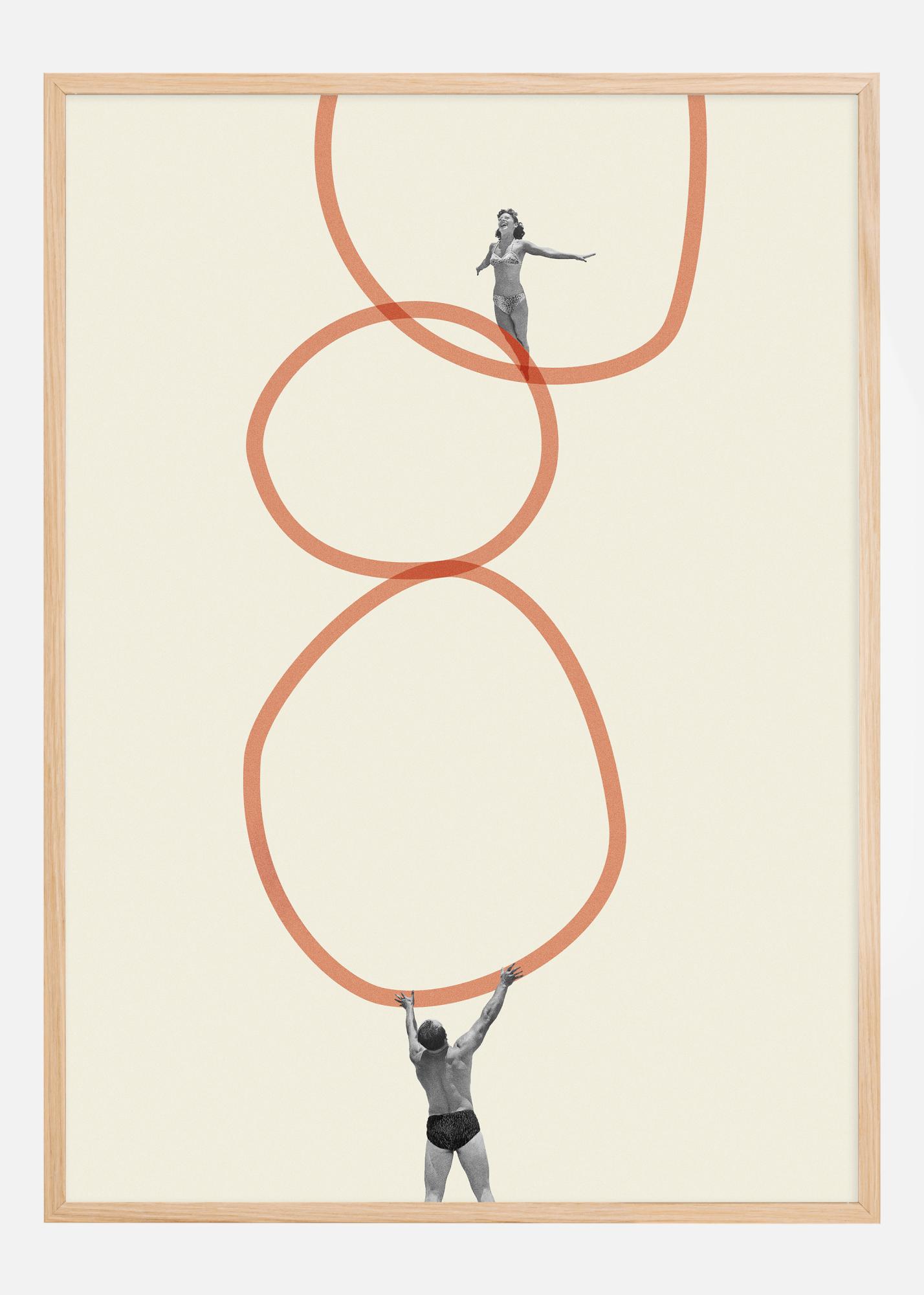 This unique poster presents a composition reminiscent of a dance of contours and human interaction. The image shows a person in a sweeping motion, balanced by another figure standing strong and steady on the ground, both framed by flowing terracotta-red circles that create a sense of movement and continuity.